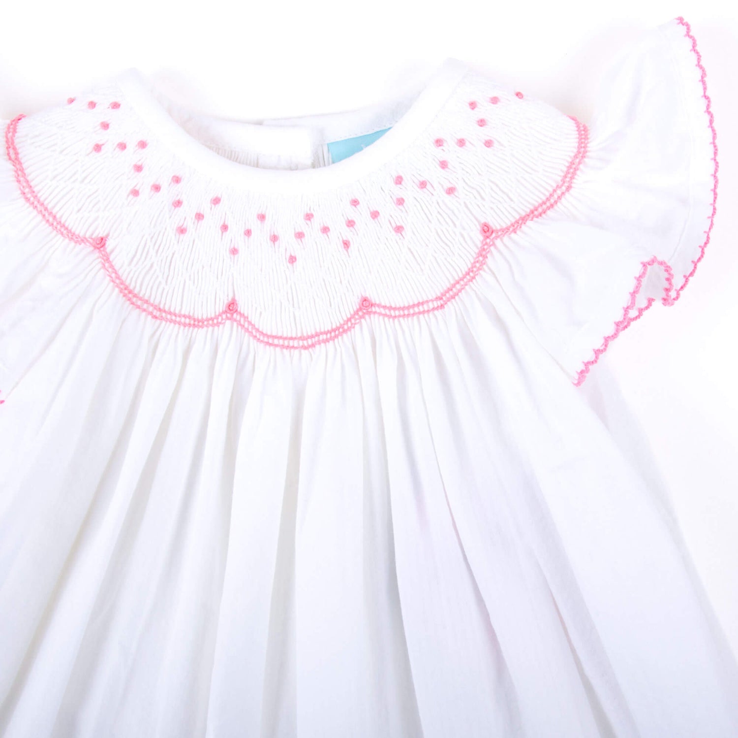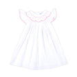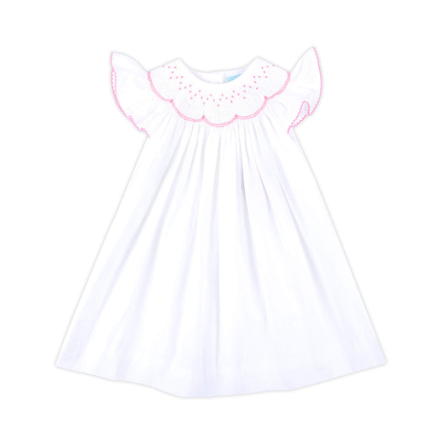 Your little sweetie will be all smiles in our Geo Smocked White Seersucker Angel Sleeve Dress! This darling dress features geometric smocking and fluttery sleeves with pink picot trim for the perfect touch of charm. Made for twirling through sunny days and sweet celebrations!