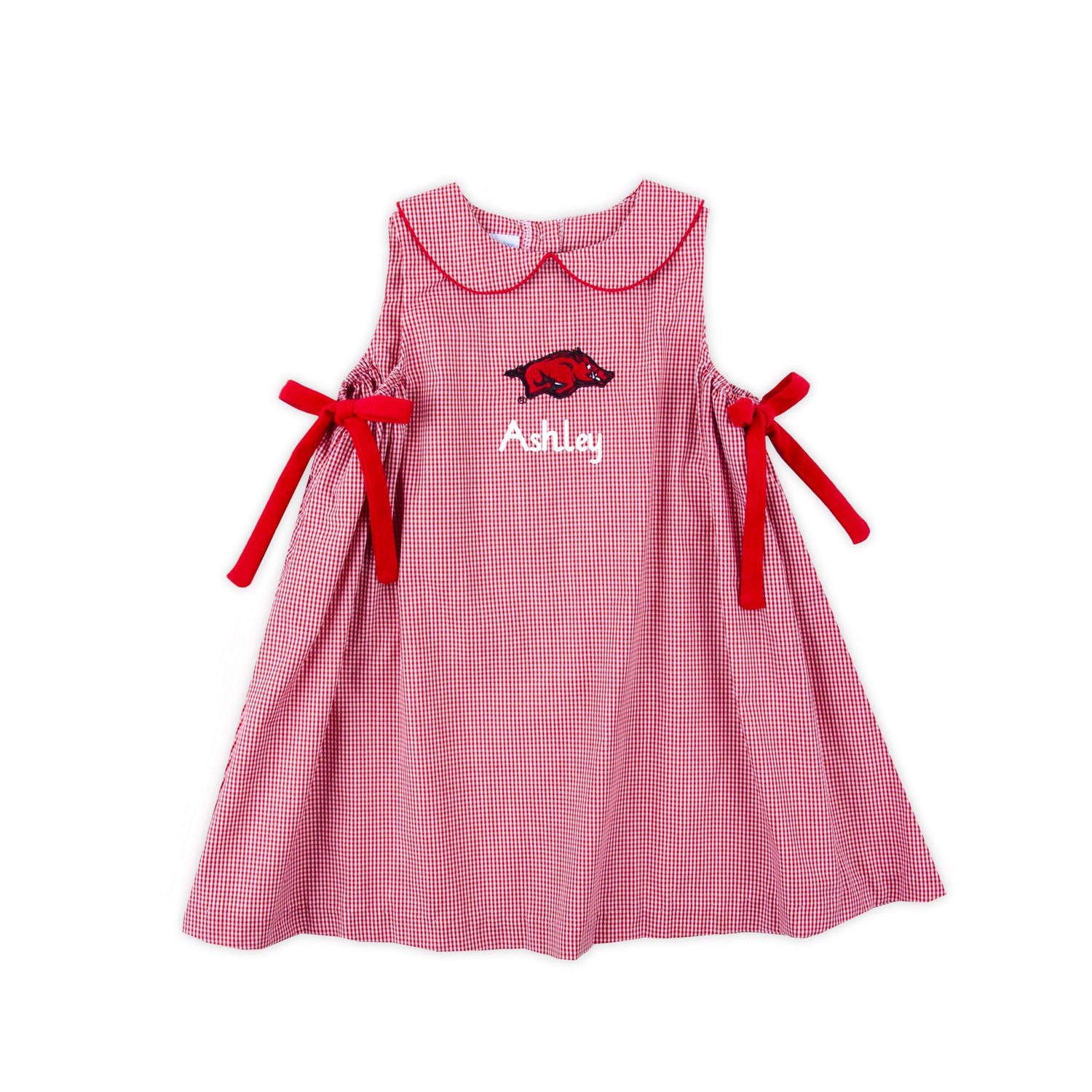 Go Razorbacks! Show your spirit with our Arkansas Embroidered Red Dress. This sleeveless gingham dress features a charming peter-pan collar, and sweet red side-tie bows, all complemented by the embroidered Arkansas! logo. Whether you're cheering from the sidelines or watching the game at home, this is the perfect outfit to support your team in style! Add a name monogram!