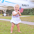 This Flag Smocked White Pique Sun Bubble is perfect for celebrating the 4th of July in classic patriotic style. Designed in white pique, it features smocked flags for a sweet, festive look. Shoulder buttons and snaps at the stride allow for easy changing.