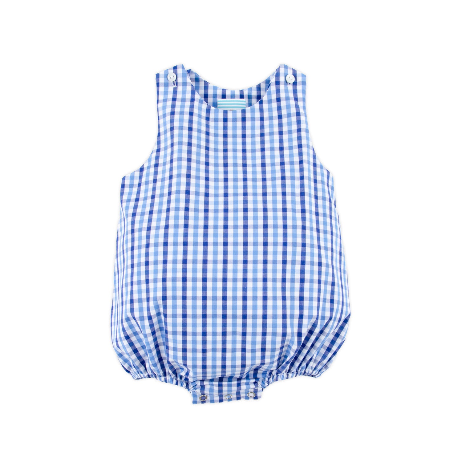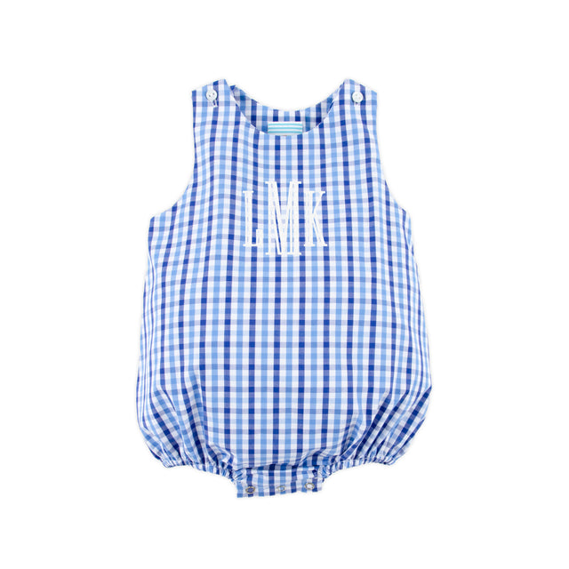 Celebrate the joys of summer in our Summer Time Blue Gingham Sun Bubble. This blue gingham outfit is the perfect addition that perfectly matches our Summer Time collection. Personalize the look with a monogram. With convenient shoulder buttons and snaps in stride, dressing your little one is a breeze.