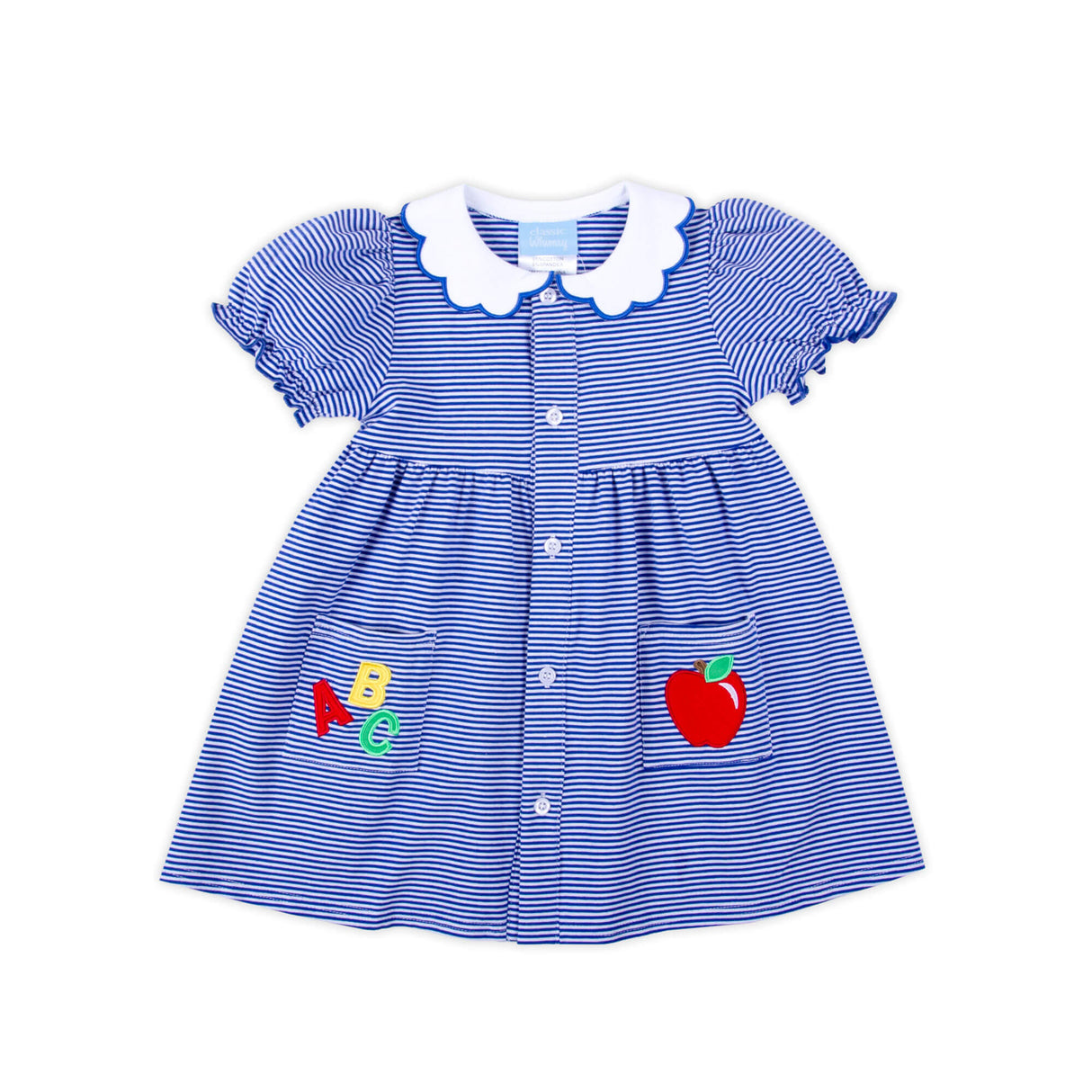 Your little one will be excited to start school in the ABC Apple Royal Blue Stripe Lola Dress! This royal blue stripe soft knit dress features front pockets with ABC appliqué and a sweet apple. Designed with a cute collar, bishop sleeves, and button details, it's perfect for back-to-school fun. Add a monogram for a personalized touch!