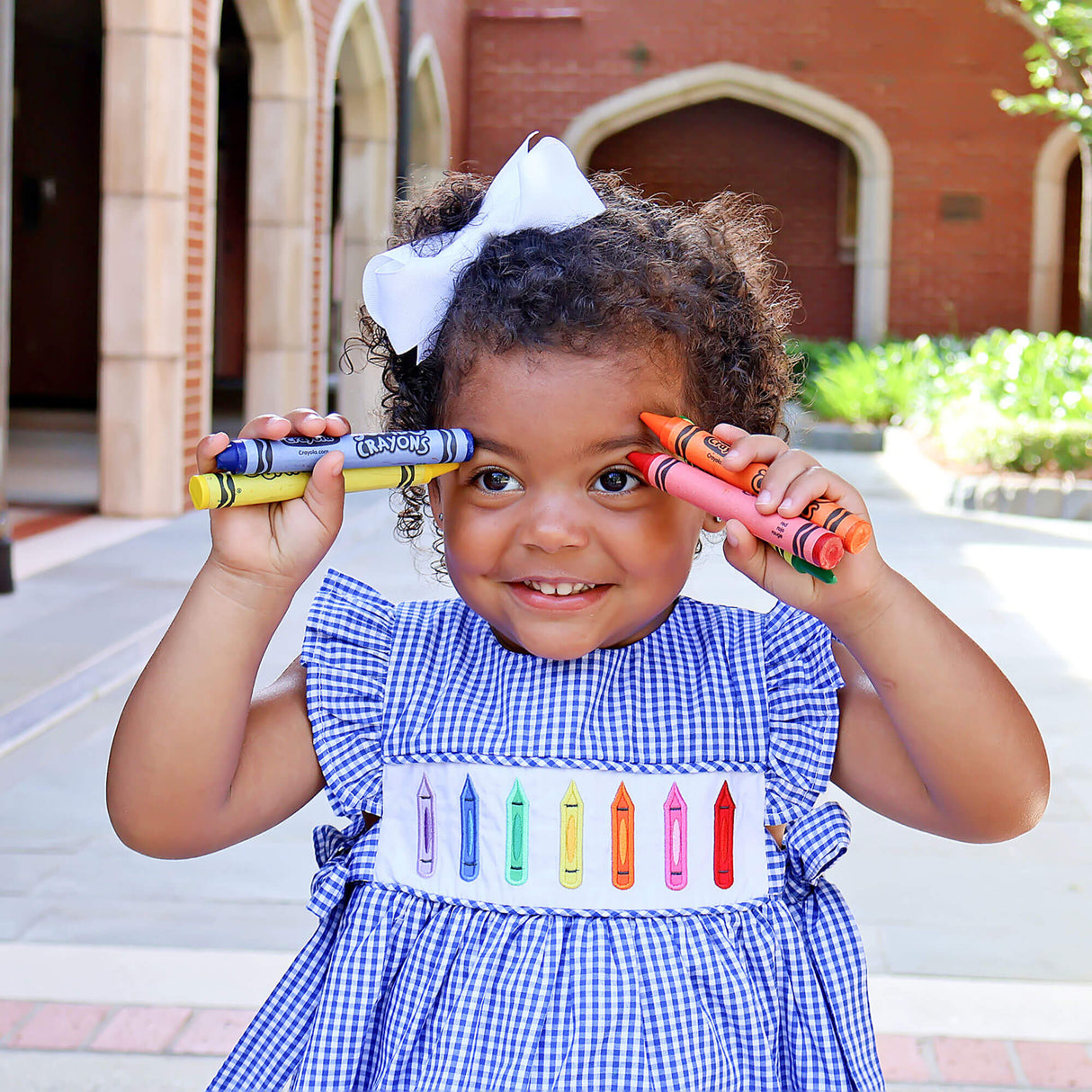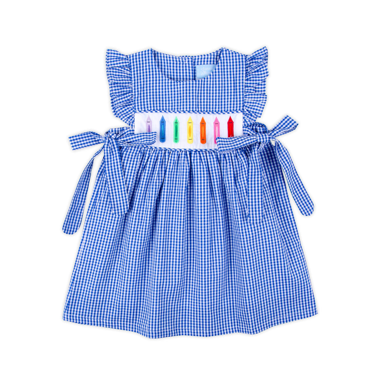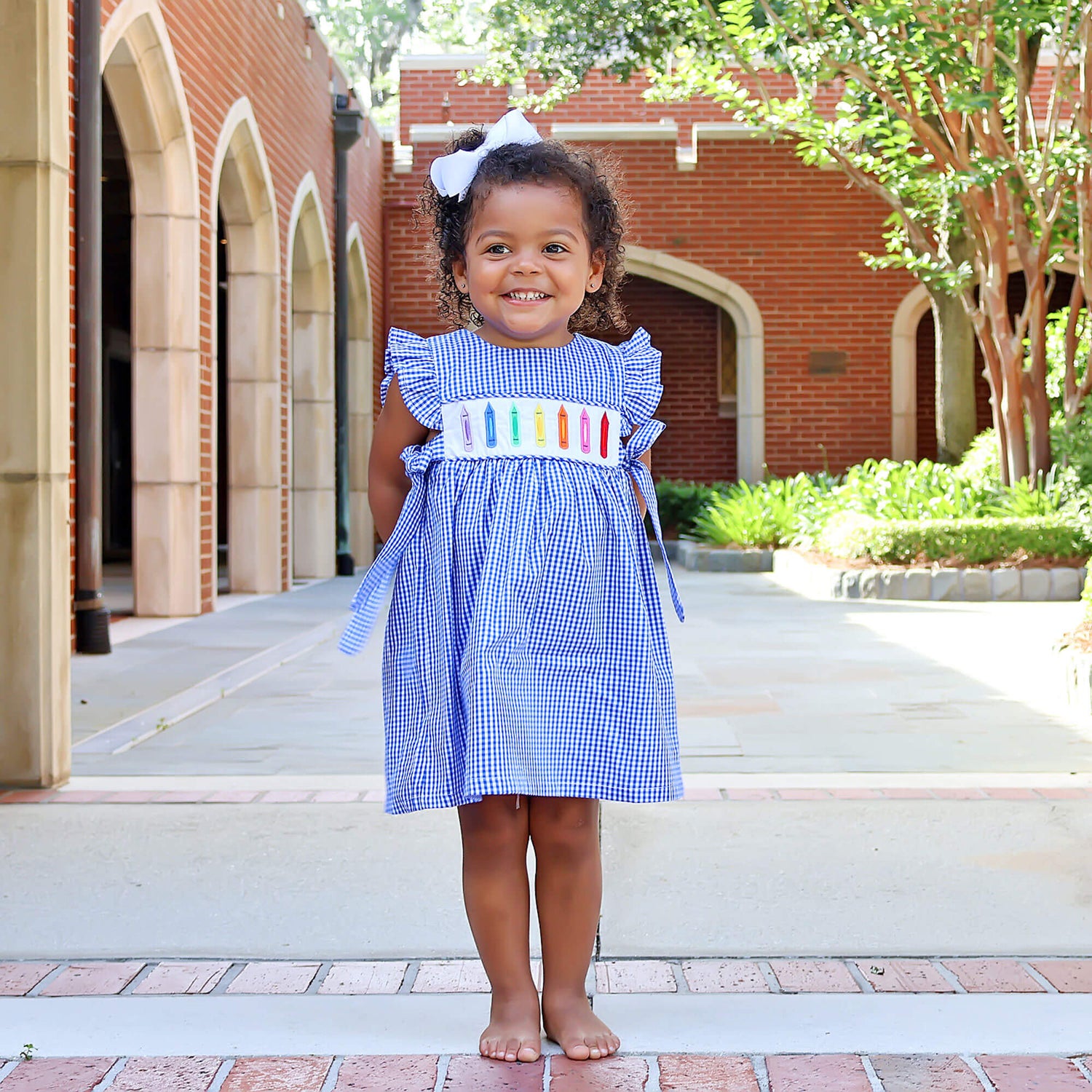 With the fall season upon us and school starting, your little one will look her best in this Rainbow Crayon Blue Gingham Avery Dress. This blue gingham Avery-style dress features colorful crayons applique and is adorned with side tie bows. It's the perfect outfit for your little artist.