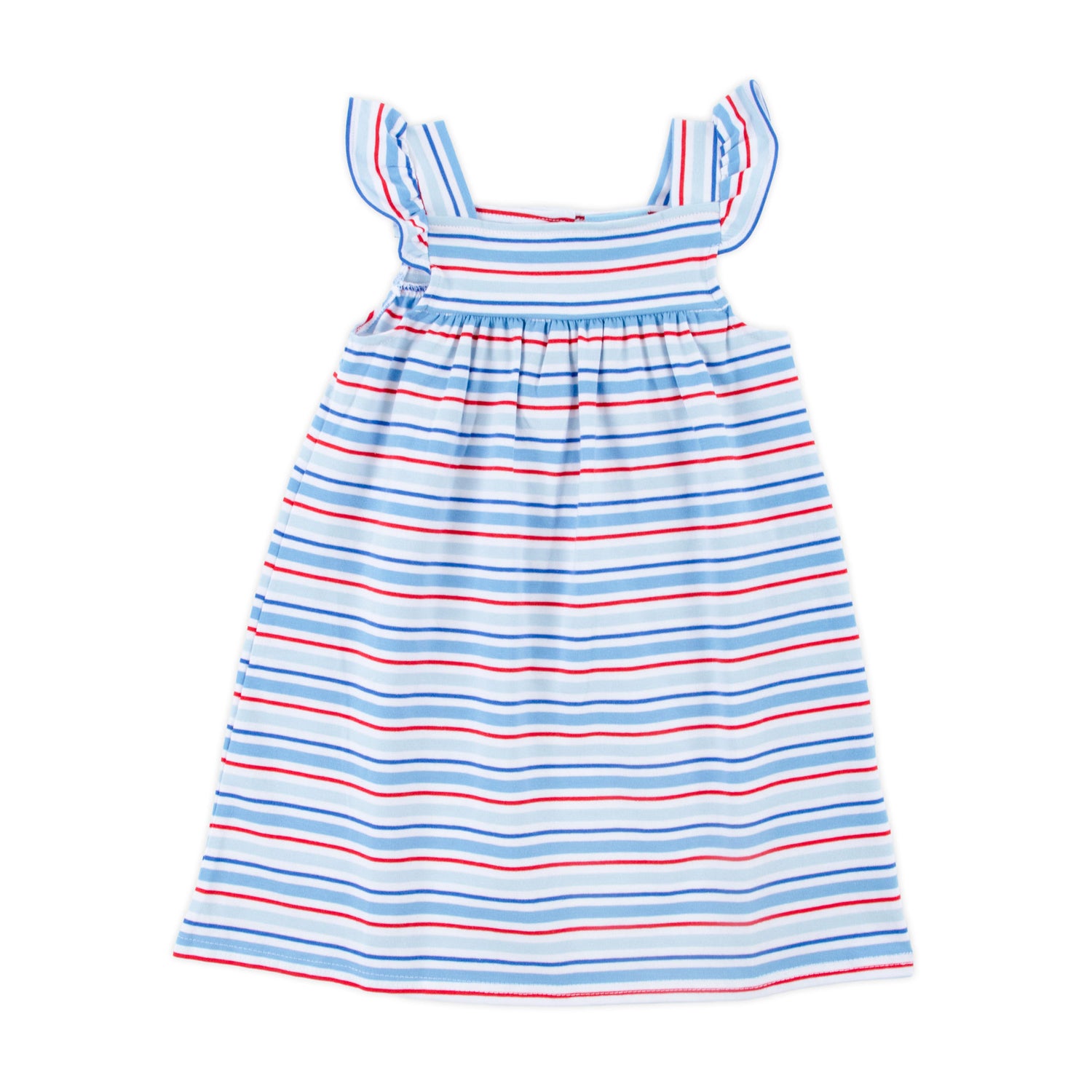 Dress up for playtime in our Patriotic Play Red & Blue Stripe Amy Dress, a delightful outfit that combines blue and red knit stripes with charming flutter sleeves. Ideal for various occasions this spring and summer, this dress adds a touch of playful style to any day. It's the ideal outfit to celebrate and feature your patriotism at any patriotic event.