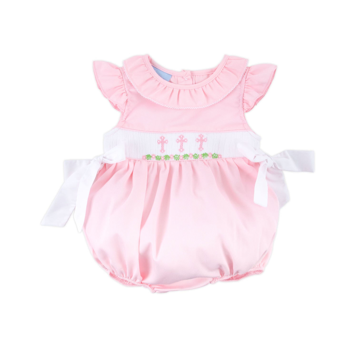 Beautiful Pink Cross and Vine Smocked Beverly Bubble. Features hand-smocked pink crosses, side bows, ruffle collar, and snap in stride. Perfect for Christenings or Easter!