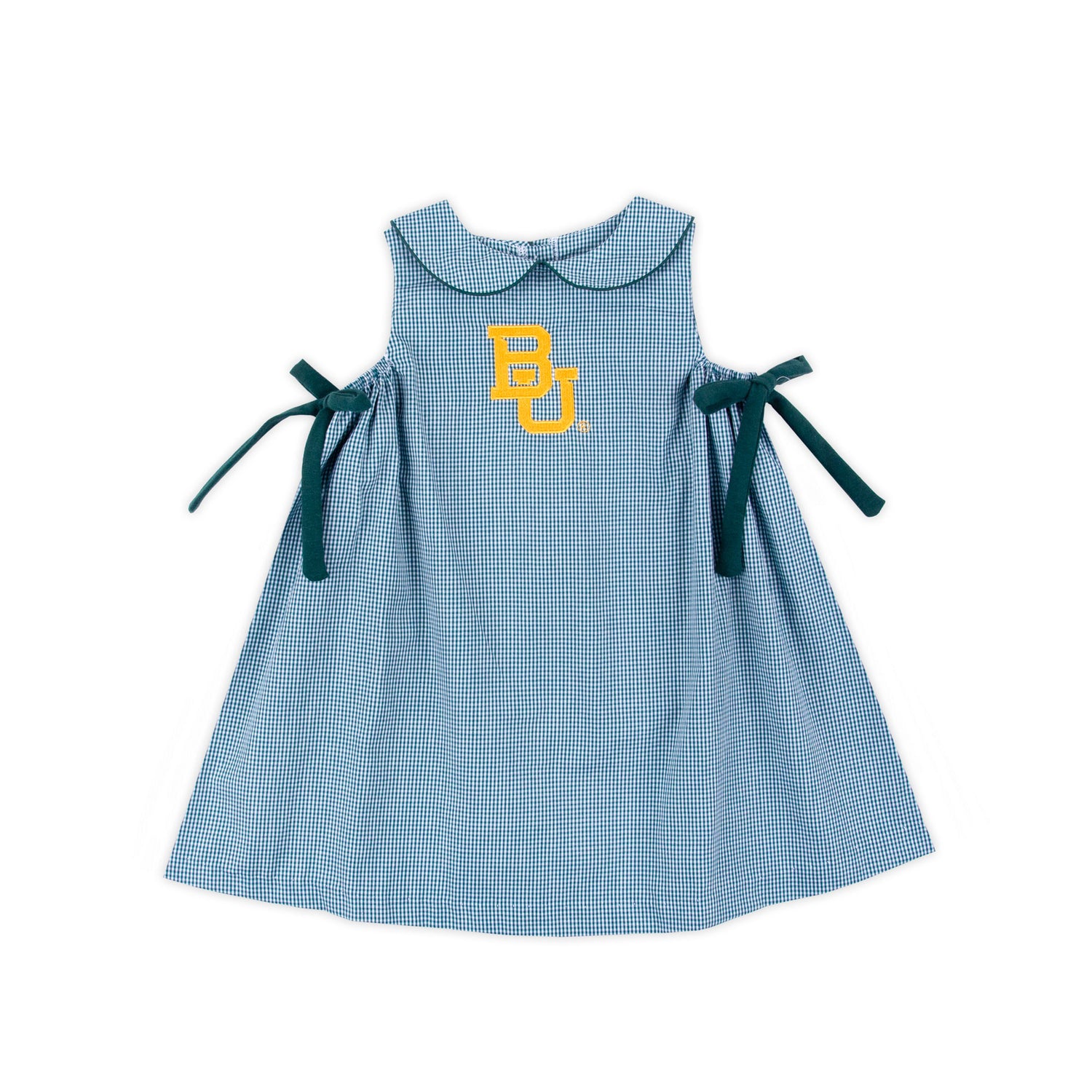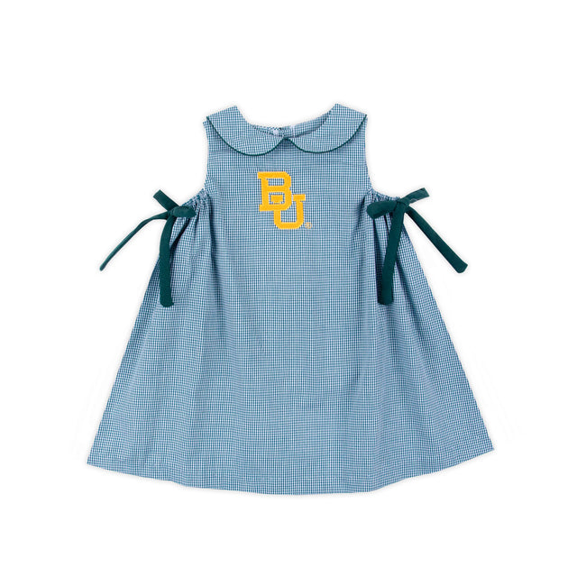 Sic 'Em! Go Bears! Your little one will look adorable this football season in our Baylor Embroidered Hunter Green Gingham Dress. This sleeveless green gingham dress features a collar, Baylor embroidered logo, and sweet side-tie bows. Add a name monogram!