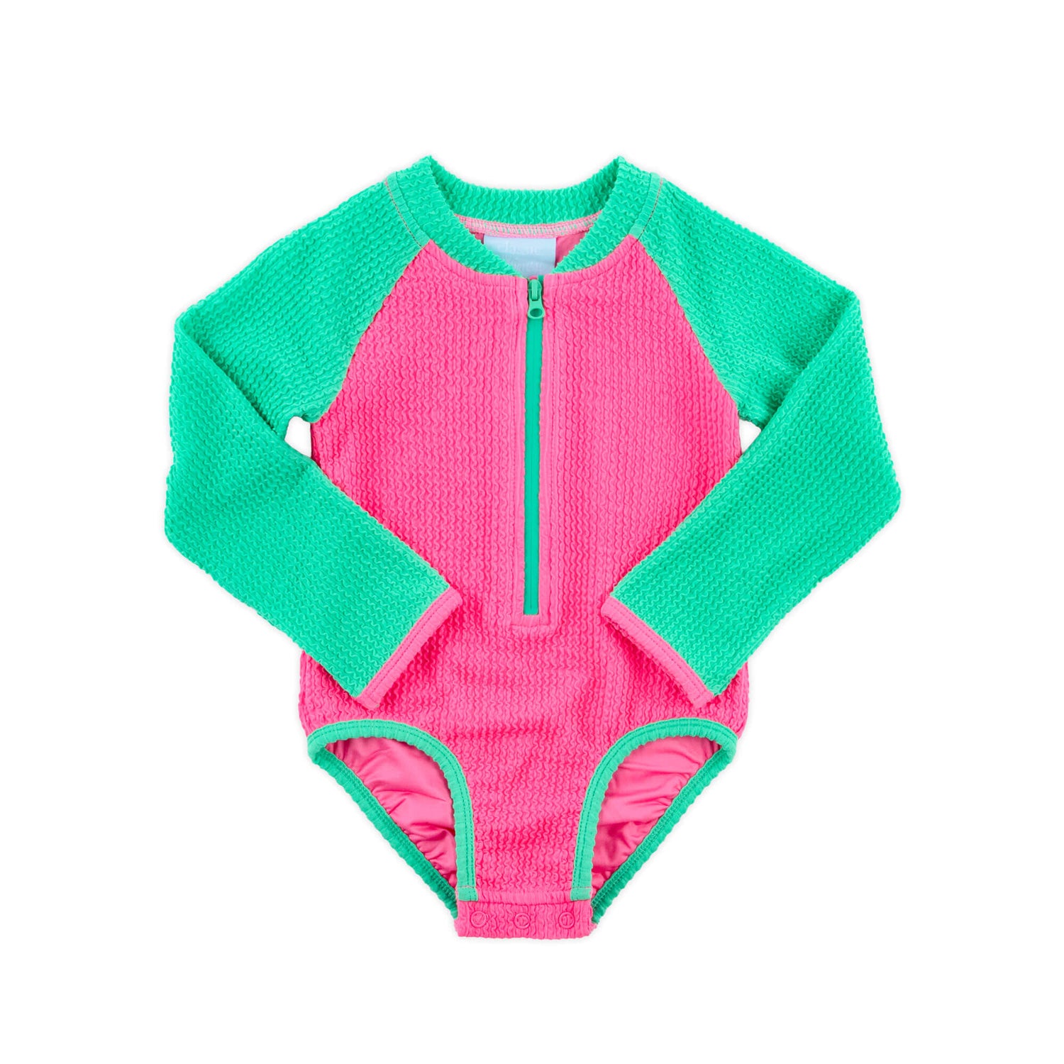 This Aquamarine Green & Hot Pink Crinkle Rash Guard Swimsuit is perfect for pool days or trips to the beach. This one-piece swimsuit features a light-stretch crinkle fabric, long sleeves for sun coverage, and a front zipper for easy changing. With UPF 50 protection, it helps keep your little one safe while enjoying the sunshine.