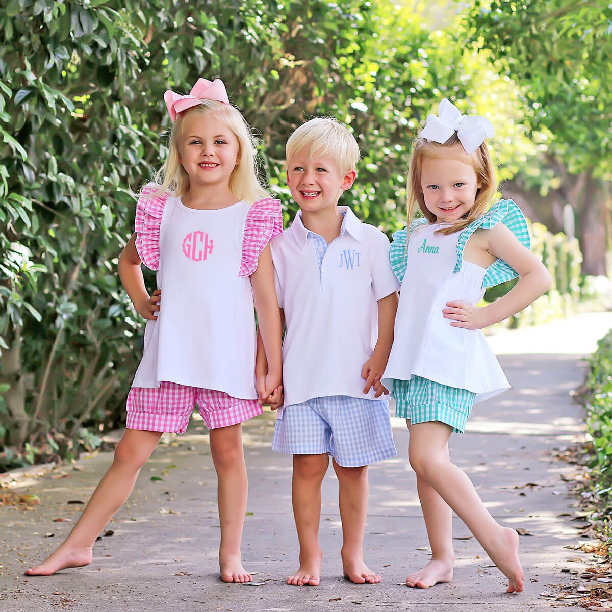 Embrace the enchantment of sunny days with our Pastel Blue Gingham Polo Short Set, the perfect outfit for all your spring and summer adventures. The charming white polo is coordinated with playful blue gingham shorts, creating a delightful outfit. For a personalized touch, add a monogram! It's the ideal choice for a season of delightful moments.