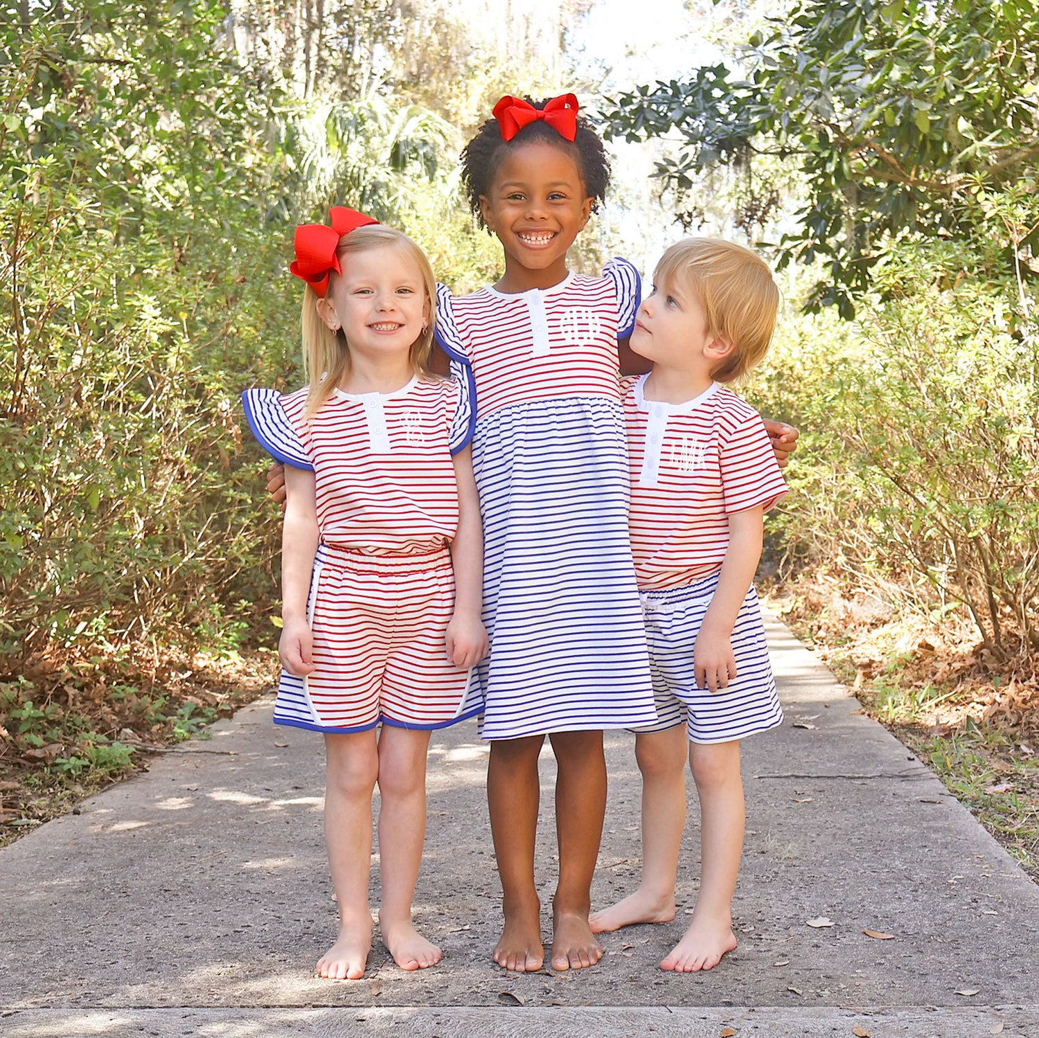 This Patriotic Colorblock Jade Dress is the perfect outfit for watching fireworks and enjoying outdoor play. Made from red, white, and blue striped French terry, this dress features flutter sleeves and henley buttons for a sweet patriotic touch. Add a monogram to personalize this look.