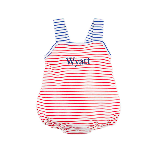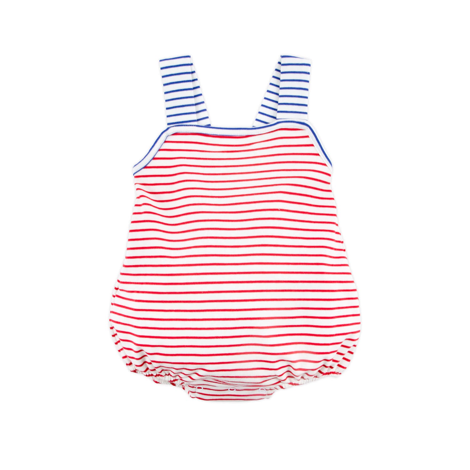 This Patriotic Colorblock Sun Bubble is the perfect outfit for watching fireworks and enjoying outdoor play. Made from red, white, and blue striped French terry, this sun bubble features wide cross-back straps for a fun patriotic touch. Snaps in stride allow for easy changes. Add a monogram to personalize this look.