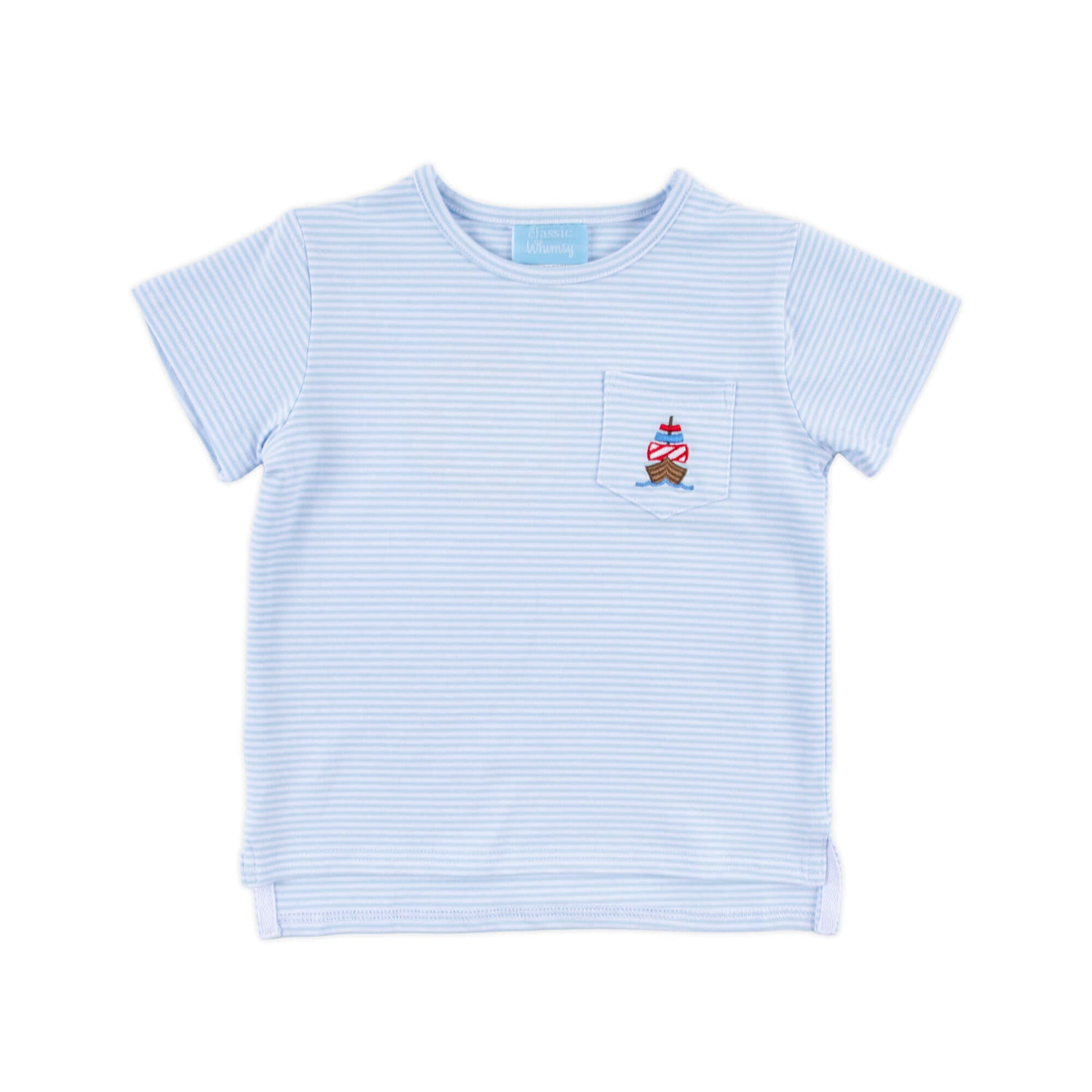 This Sailboat Light Blue Stripe Short Sleeve Pocket Shirt is perfect for playtime fun. Made from a soft stripe knit, this short sleeve shirt features a side pocket with an embroidered sailboat for an extra cute touch. Easy to wear and full of personality, it’s a favorite choice for everyday adventures.