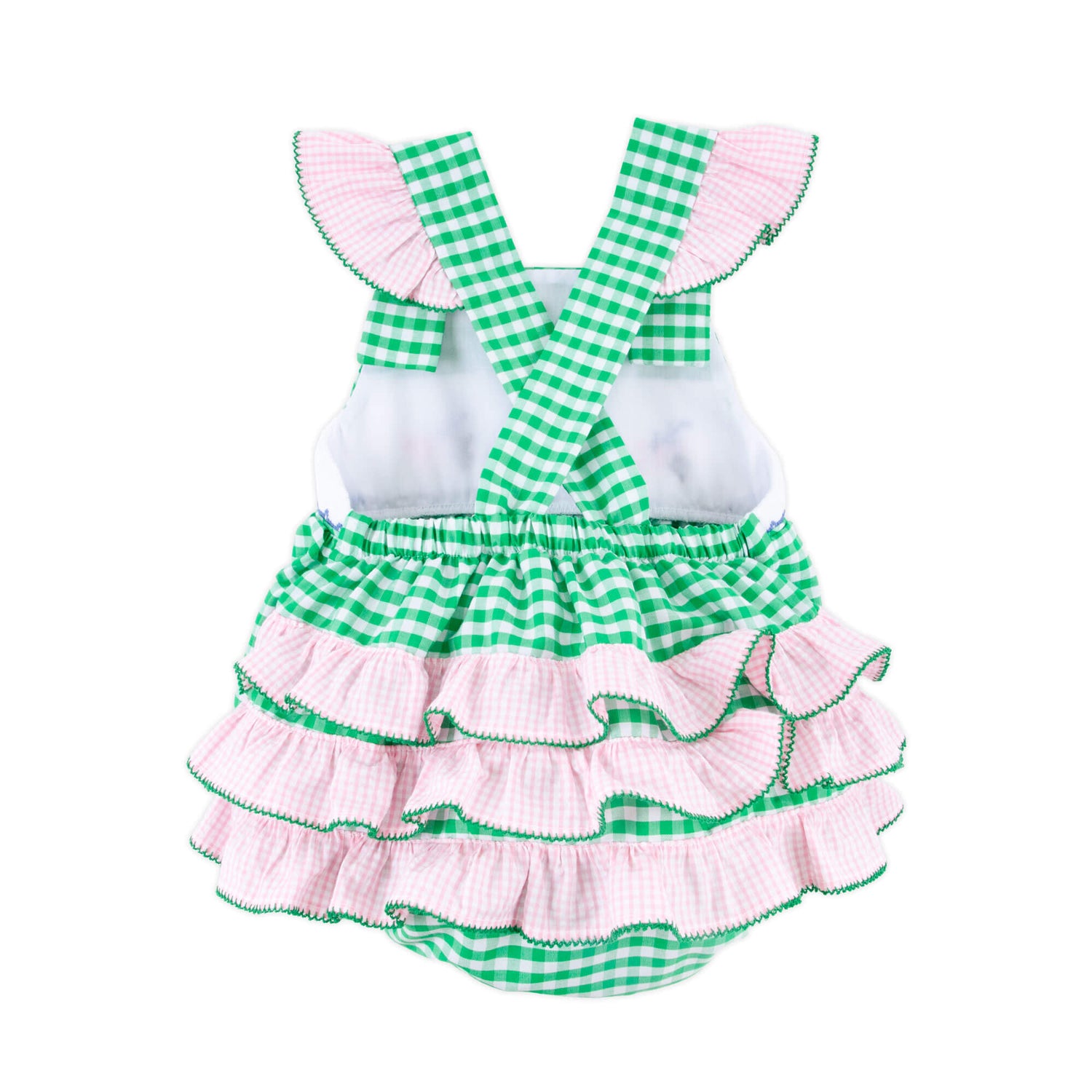 Our Whale Smocked Green Gingham Leah Bubble is the perfect choice for vacations and seaside adventures. Designed in classic green gingham, this charming bubble features cross-back straps, sweet pink gingham back ruffles, and hand-smocked whale detail for a timeless nautical look. Snaps at the stride allow for easy changes.