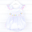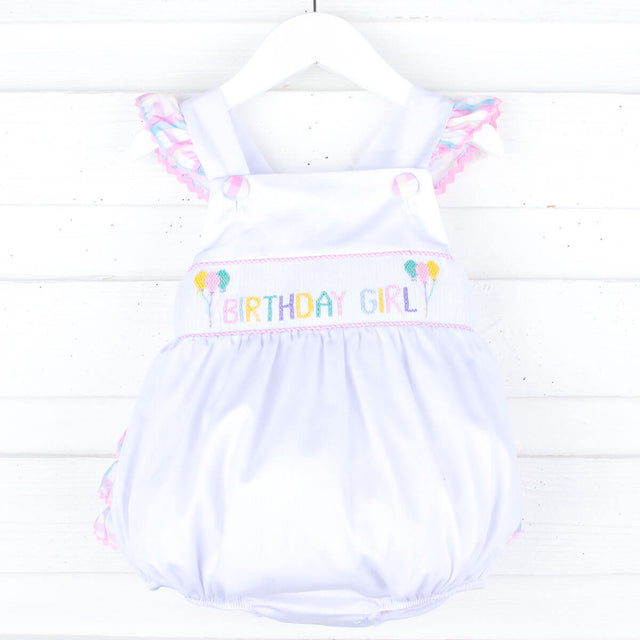 Your birthday girl will look absolutely adorable on her special day! This white Leah bubble is perfect for the celebration, featuring smocked 'Birthday Girl' and balloons, sweet back ruffles, and convenient snaps for easy changing.