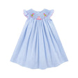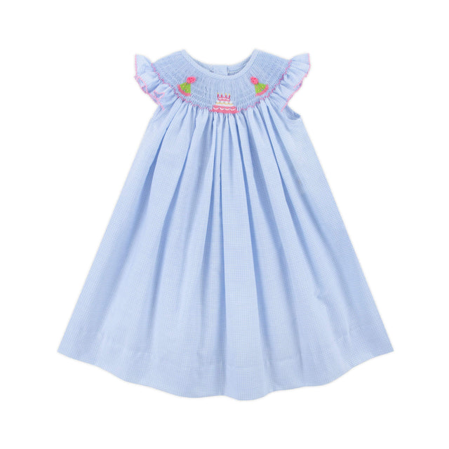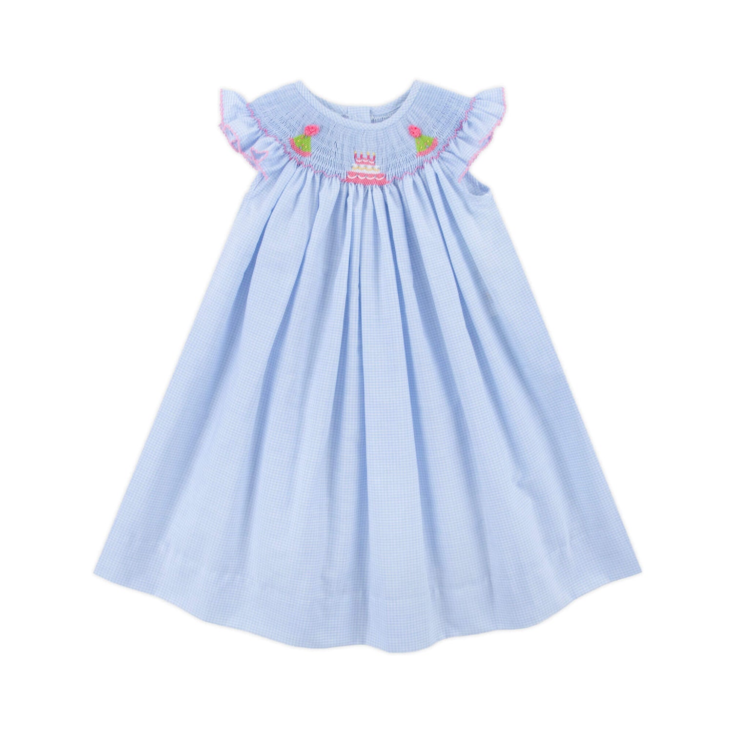 Celebrate your little one's Birthday party with our cute dress! Adorable hand-smocked party hats and a cake on this light blue gingham.