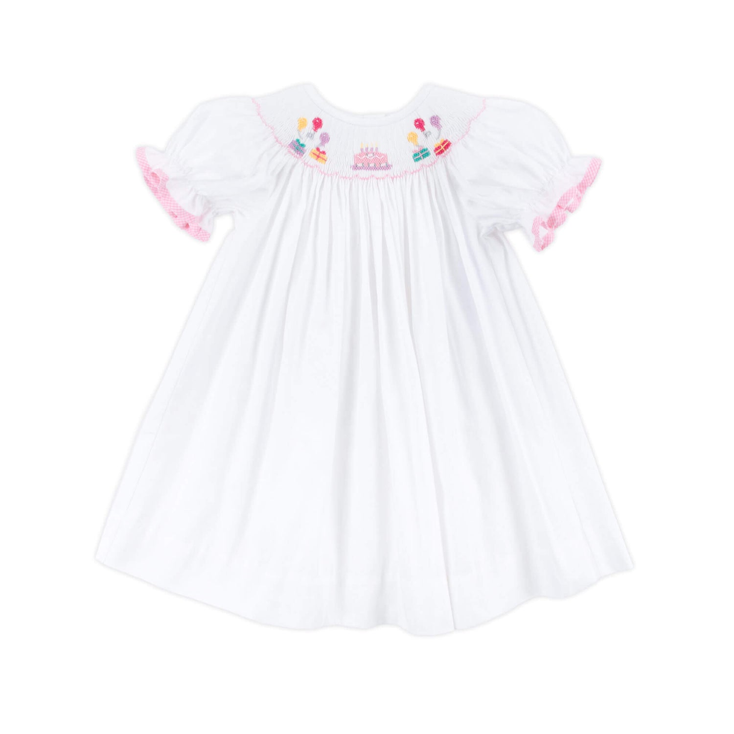It's time to party with the cutest birthday celebration in our party dress! The hand-smocking features a birthday cake, presents and balloons. Bishop sleeves with light pink gingham tape trim finish the look of this precious white dress. Your little girl will be adorable in her birthday photos!