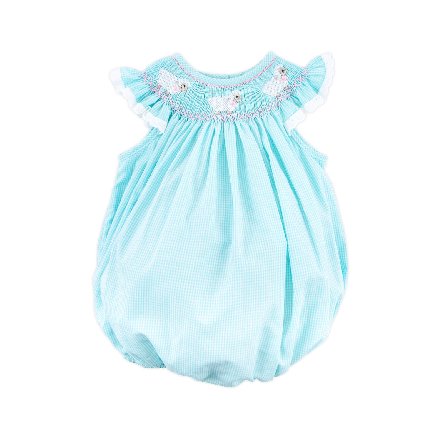 Get your little one ready to celebrate Easter Sunday in our Lamb Smocked Bubble Mint Gingham! This festive mint gingham bubble is adorned with precious smocked lambs and features angel flutter sleeves trimmed with white eyelet, adding a touch of springtime charm. Snaps in stride for easy changes. Perfect for church, family gatherings, and Easter festivities!