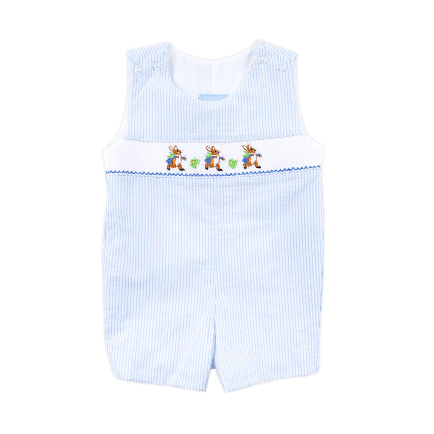 Prepare for Easter in style with our Storybook Rabbit Smocked Jon Jon. This sweet light blue seersucker Jon Jon features a smocked design showcasing our favorite book rabbit character. With convenient shoulder buttons and snaps in stride, it's not only charming but also practical for dressing up your little one for Easter.