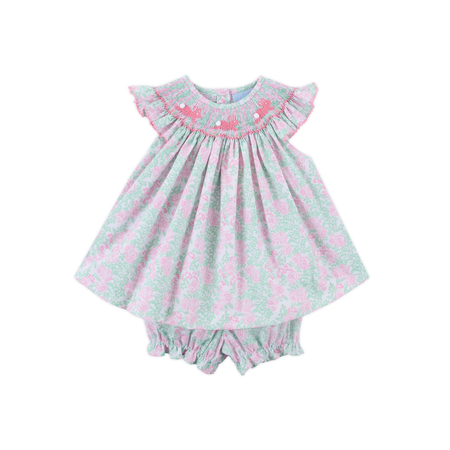 Celebrate Easter in style with our Blooming Garden Smocked Pink Angel Sleeve Bloomer Set! The sweet top features a lovely pink rose print and fluttery angel sleeves trimmed with pink ric-rac, paired with matching floral bloomers perfect for springtime gatherings. Snaps in the stride make dressing easy.