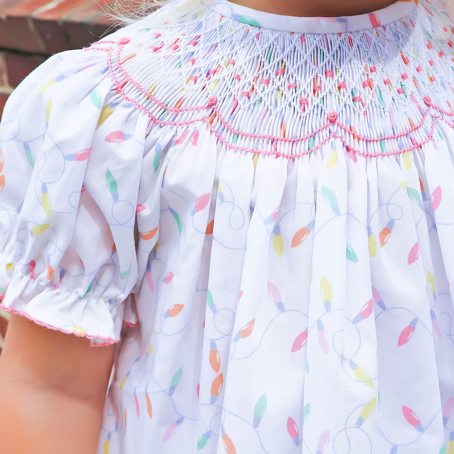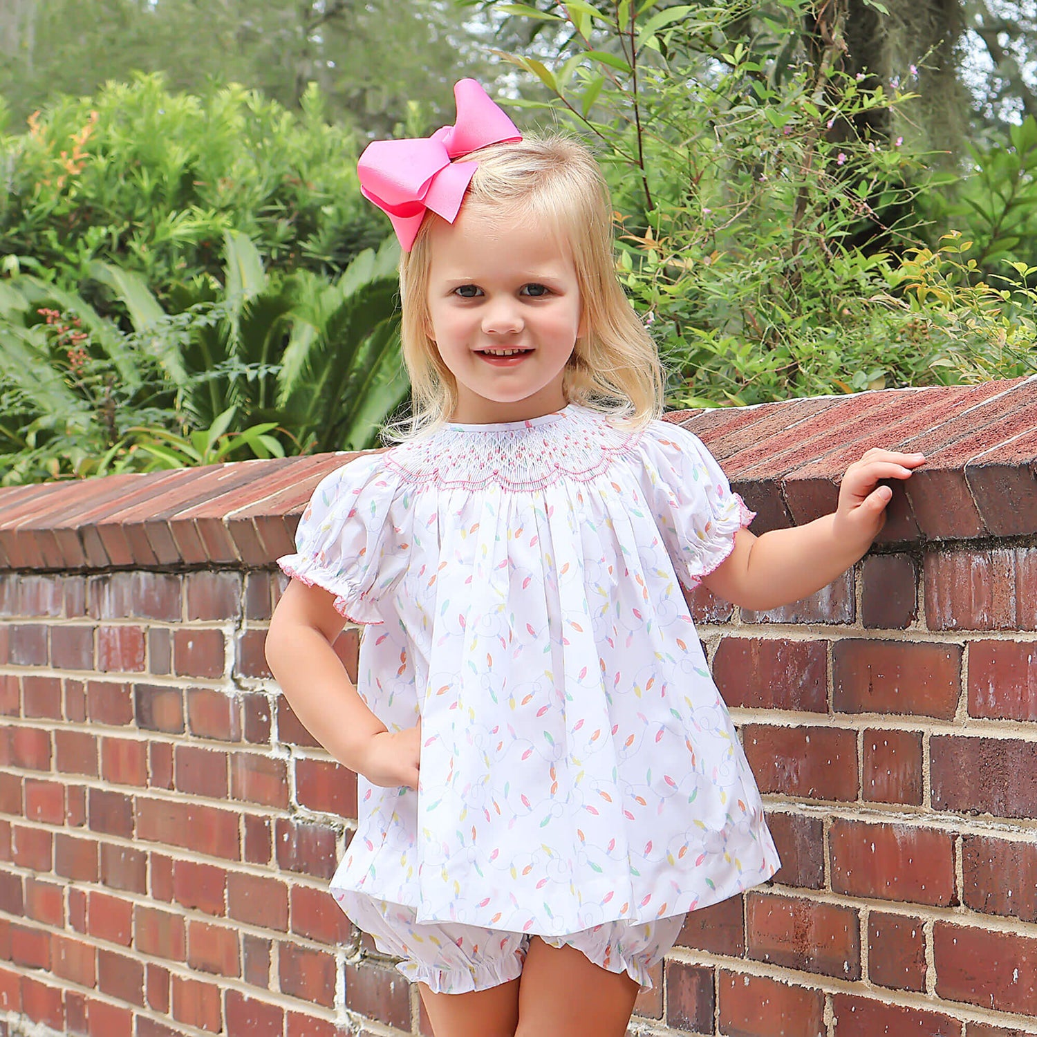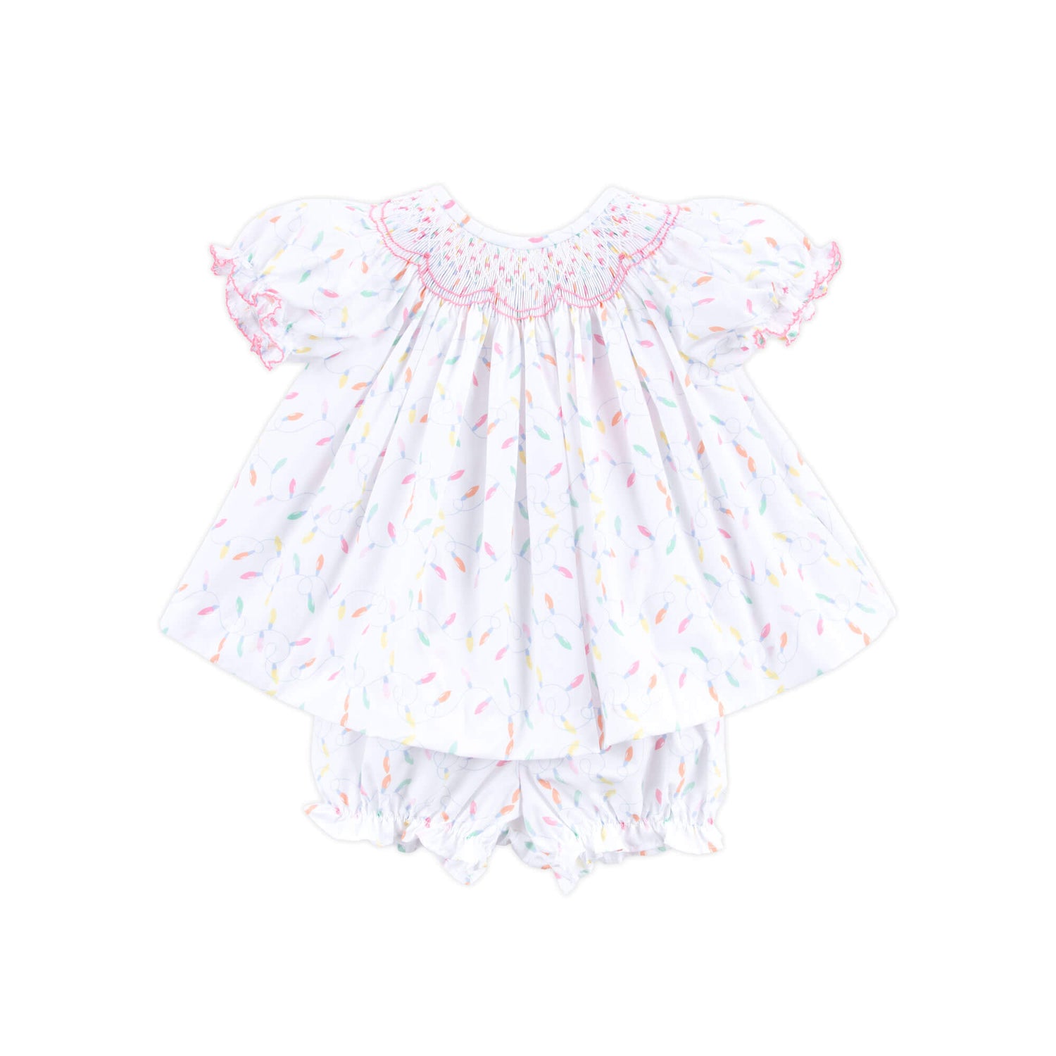 Christmas Lights White Print Smocked Bloomer Set