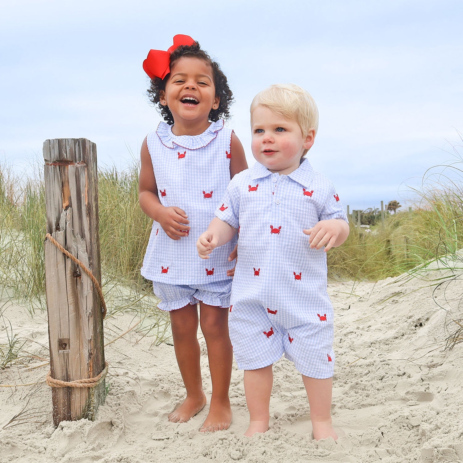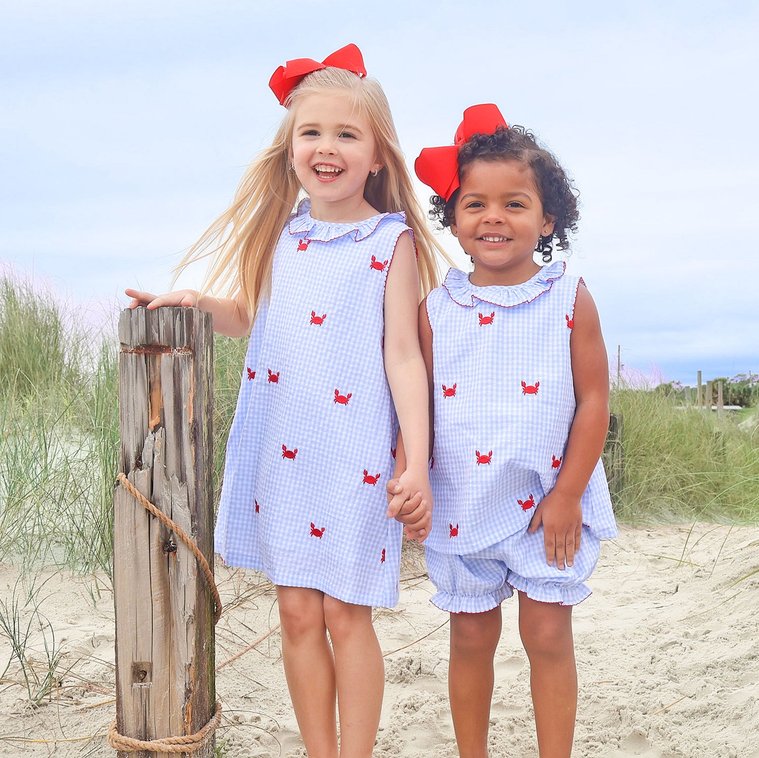This Crab Schiffli Blue Gingham Ruffle Collared Bloomer Set is a perfect summer pick for your little one. The sleeveless blue gingham top features charming Schiffli embroidered crabs and a sweet ruffle collar, and it is paired with matching blue gingham bloomers. It’s a darling choice for warm weather outings and special summer moments.