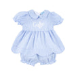 This Light Blue Stripe Collared Bloomer Set is perfect for Easter or any spring celebration. The top is designed in a light blue stripe fabric and features bishop sleeves and a sweet collar. It coordinates with matching light blue stripe bloomers. Add a monogram for the cutest finishing touch.