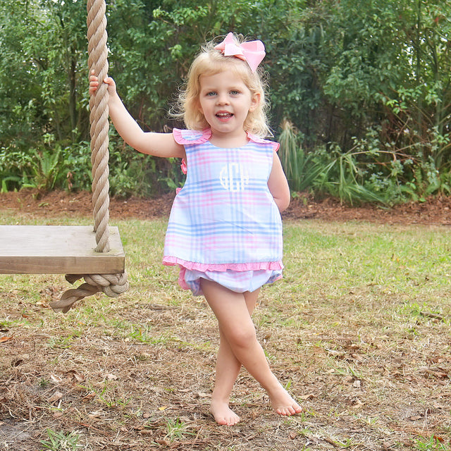 Get ready for spring and summer fun in our Pastel Plaid Popover Set! This sweet popover top features playful pastel plaid fabric and wide crossed-back straps with delicate pink picot trim for an extra touch of charm. It’s perfectly paired with matching bloomers.