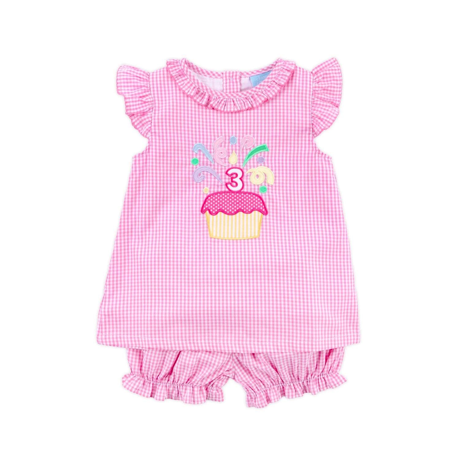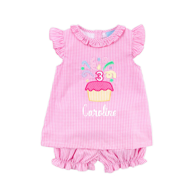 This sweet Third Birthday Cupcake Bloomer Set is perfect for your little one's Birthday! The pink gingham top features an adorable 3rd birthday applique, ruffle sleeves and collar with pink picot trim, making it a fun choice! The set comes with matching bloomer shorts. Add a monogram for a personalized touch!