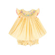 Celebrate springtime in this sweet Yellow Check Bird Smocked Bloomer Set. The yellow gingham top features charming smocked birds and soft angel flutter sleeves finished with pink ric rac trim for a darling touch. Paired with matching yellow gingham bloomers, this set is perfect for spring days and special moments alike.