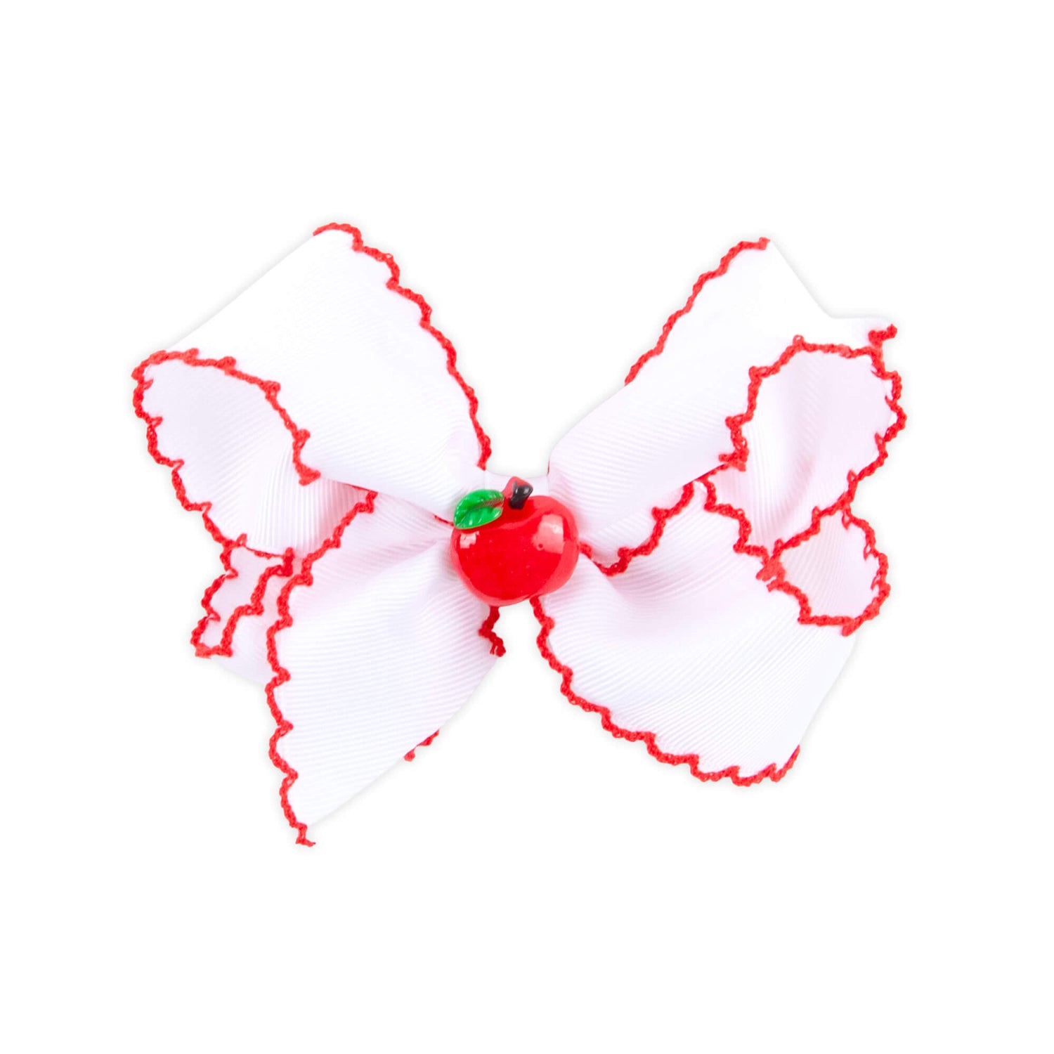 This grosgrain hair bow is perfect for little girls headed back to school. It features a beautiful red moonstitch edge and an adorable apple charm, adding a sweet touch to any outfit.