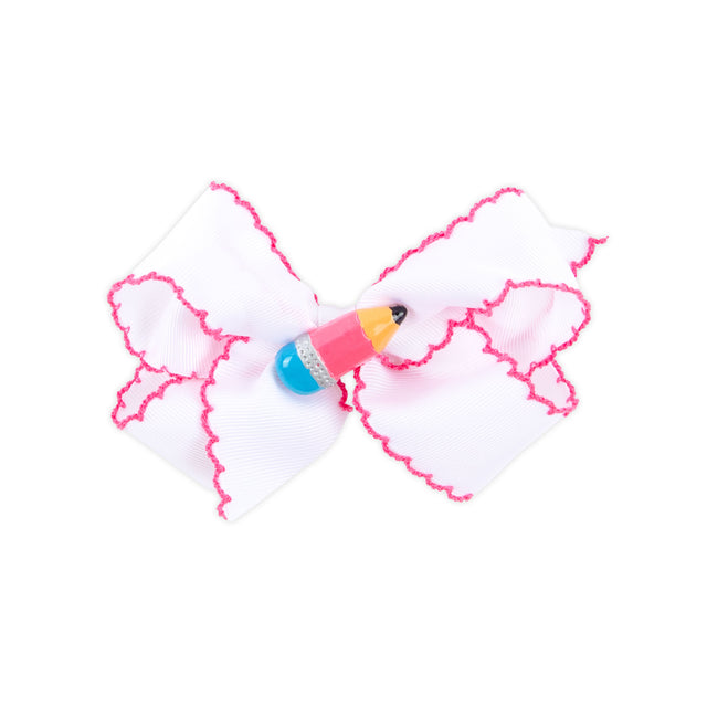 This grosgrain hair bow is perfect for little girls headed back to school. Not only does it feature a beautiful pink moonstitch edge, but it also has a cute pencil charm, adding a sweet touch to any outfit.