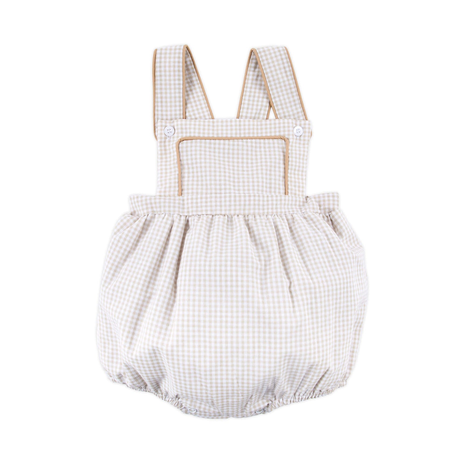 Celebrate summer in our charming Khaki Gingham Sun Bubble, a lovely choice for warm weather days and beachside family pictures. This classic khaki gingham sun bubble features front buttons and straps for an easy, timeless look. Snaps in stride allow for quick changes, making it perfect for sunny outings and special moments alike. Add a monogram to make this outfit feel even more special.