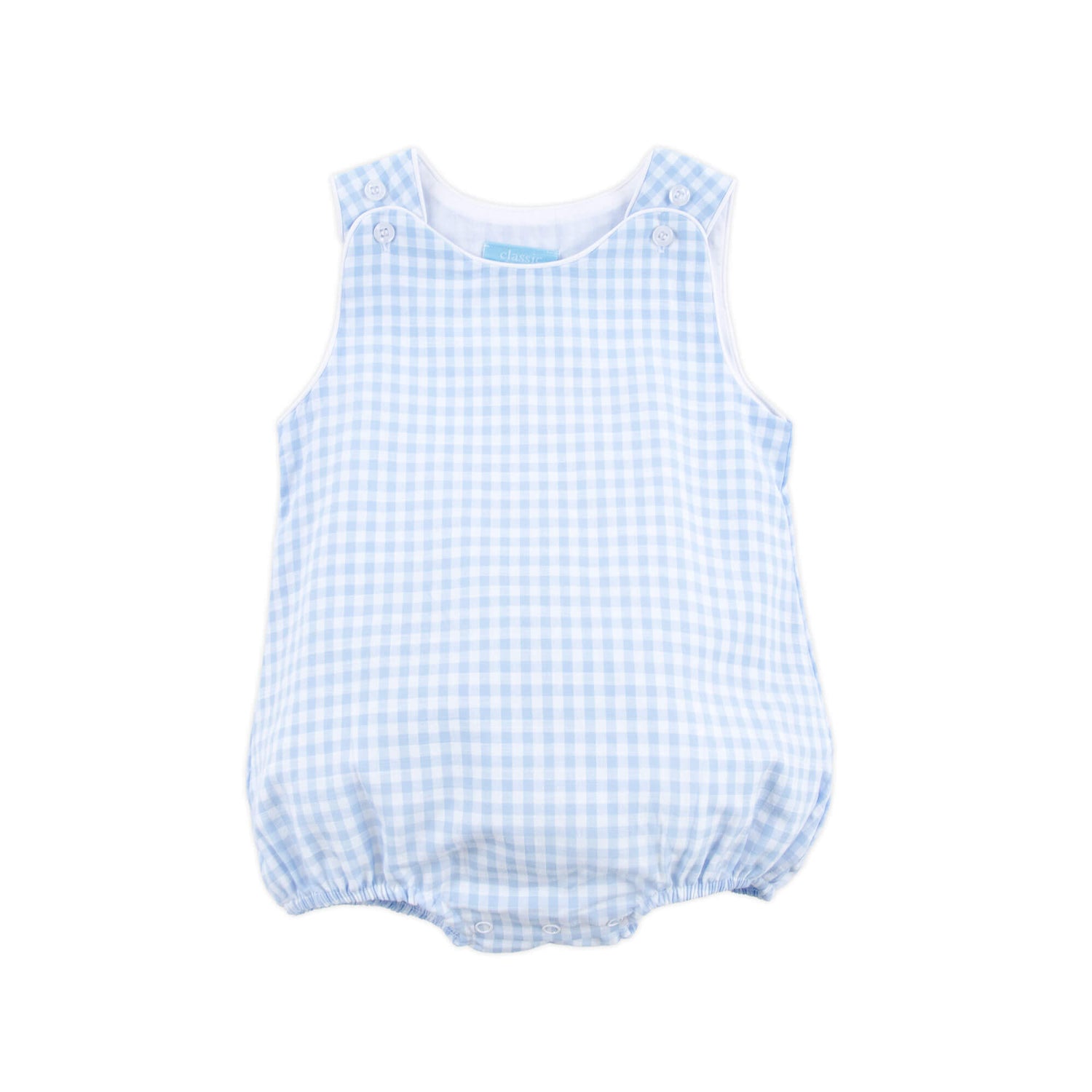 Embrace the charm of sunny days with our Pastel Blue Gingham Sun Bubble. The perfect outfit for all your spring and summer adventures. The bubble features convenient shoulder buttons and snaps in stride for easy dressing. To make this outfit uniquely his, add a monogram, infusing a personalized charm into his sunny day attire. It's the ideal choice for a season of delightful moments.