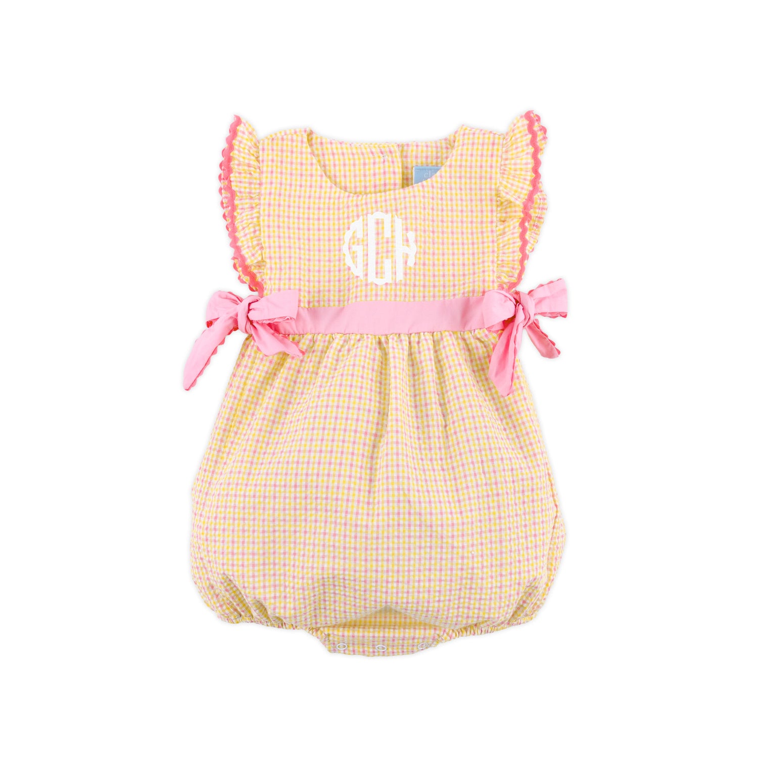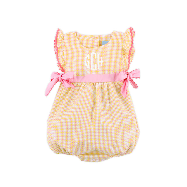 This Summer Days Pink Gingham Avery Bubble is a lovely choice for spring and summer days. Designed in a cheerful pink and yellow gingham fabric, this Avery style bubble features flutter sleeves finished with pink ric rac trim and charming side tie bows for an extra special touch. Snaps in stride for easy changes. Add a monogram to personalize the look and make it even more darling.