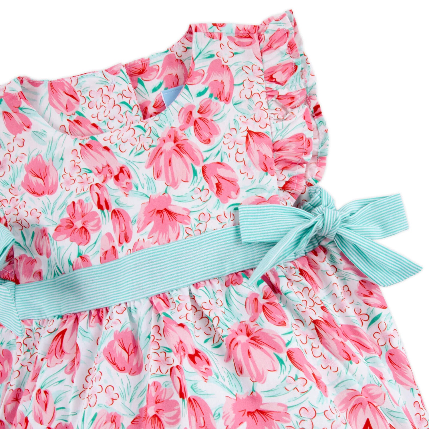 This Sweet Tulips Pink Avery Bubble is a lovely choice for spring days. Designed in a charming pink tulip print, this Avery style bubble features soft flutter sleeves finished with pink trim and sweet side tie bows for an extra special touch. Add a monogram to personalize the look and make it even more darling.