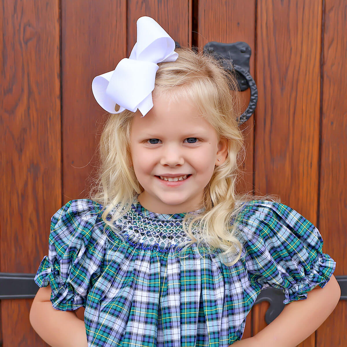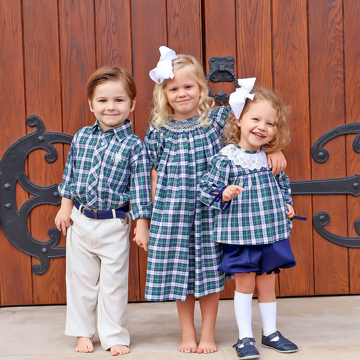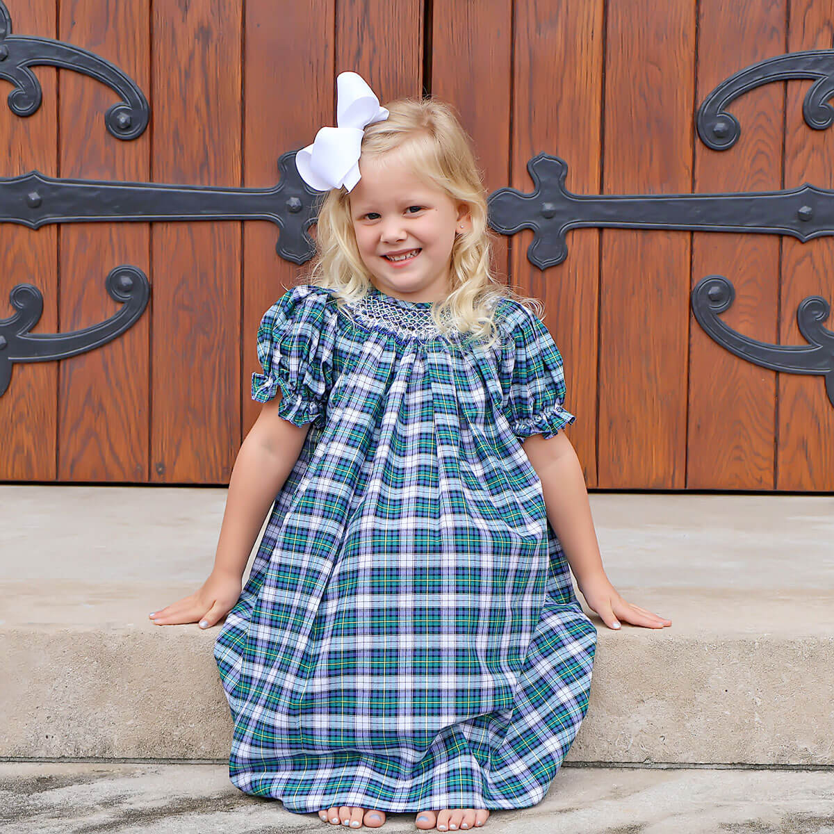 Our Brighton Plaid Geometric Smocked Bishop Dress is a timeless choice for Fall and Winter! This navy and green plaid dress features geometric smocking and elegant bishop sleeves for an extra beautiful touch.