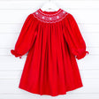 Get into the holiday spirit with this Red Corduroy Smocked Geo Bishop Long Sleeve Dress This festive red corduroy dress features sweet white geometric smocking and classic bishop long sleeves. Celebrate Christmas in style with this stunning outfit!