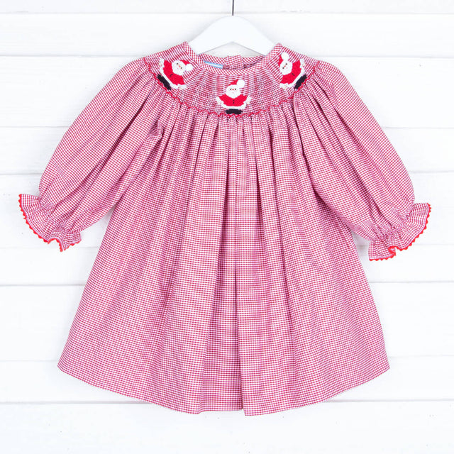 Get your little one ready for the festive season with this Santa Is Coming Long Sleeve Bishop Dress, perfect for Christmas cards, holiday parties, or a special visit with Santa. This charming dress features smocked Santa Claus and bishop long sleeves with red ric-rac trim.