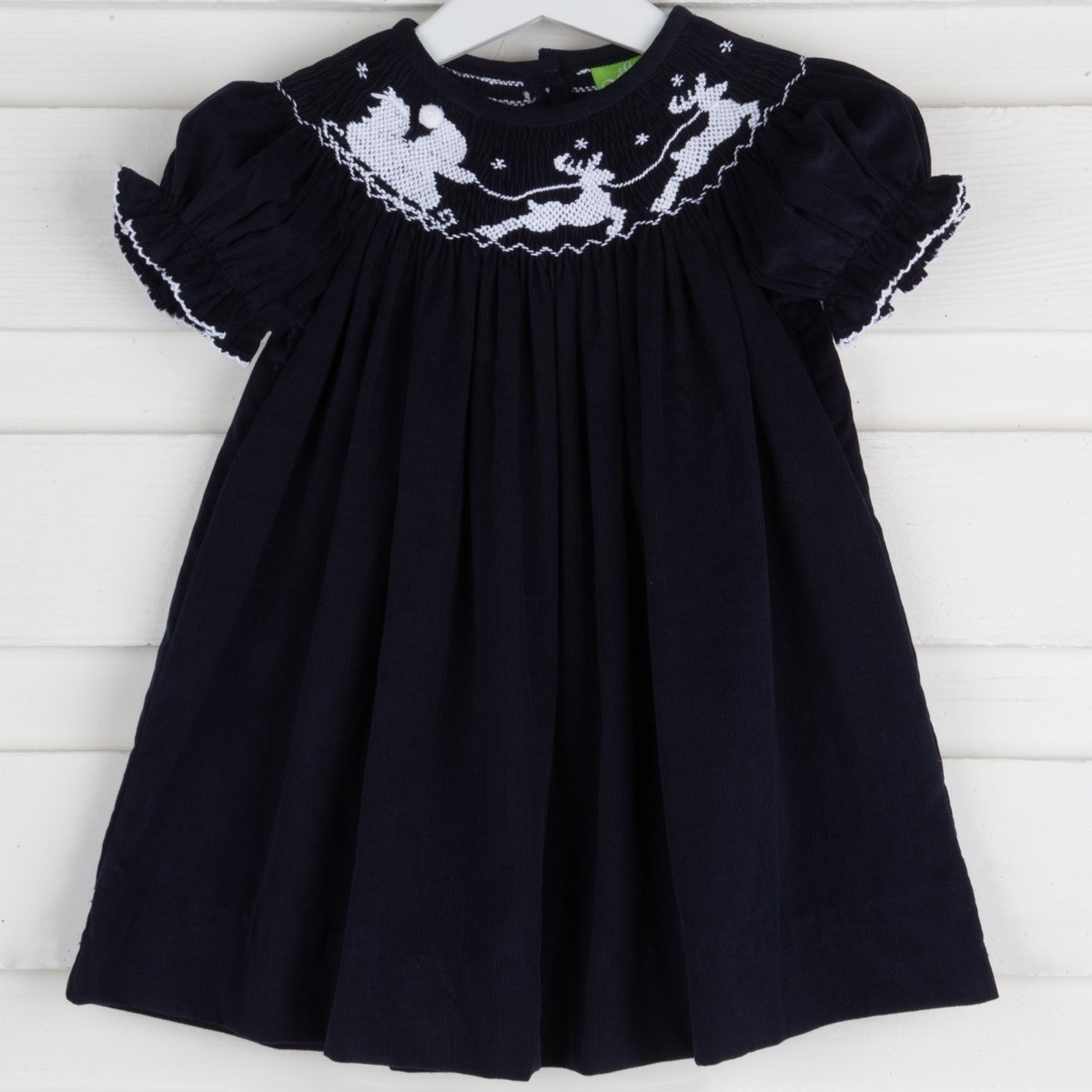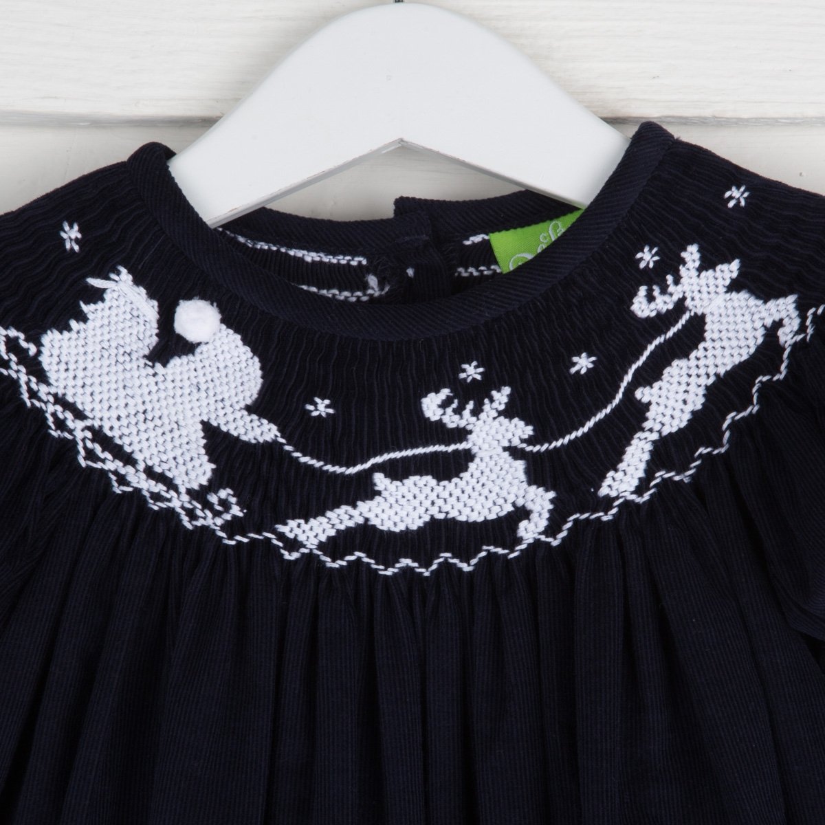 Get in the Holiday spirit with our Santa Sleigh Smocked Bishop Navy Corduroy dress. This gorgeous dress features bishop sleeves with white picot trim, and a smocked Santa sleigh on a navy corduroy fabric. Perfect for this Christmas!