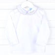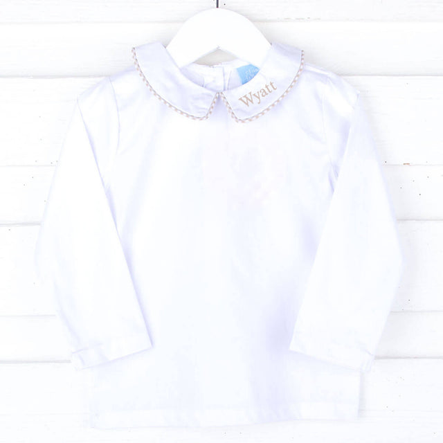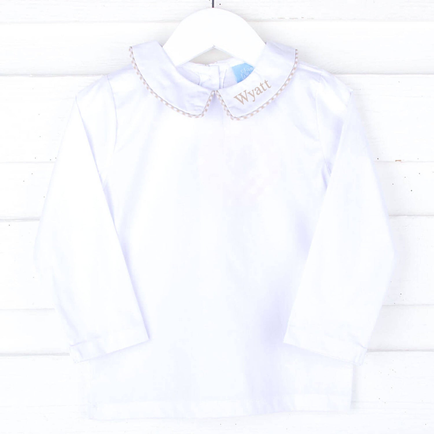 Add this White Undershirt with Color Trim to your little one's fall and winter wardrobe. This long sleeve white shirt features a collar with piping available in a variety of colors including tan gingham, red, green, light blue and royal blue.