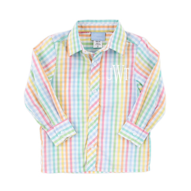 Bright and cheerful, the Colorful Multi Plaid Button-Down Shirt is a classic choice for spring and summer. Designed in a vibrant multicolor plaid, this long-sleeve shirt is perfect for sunny days and special occasions. Add a monogram for a personalized touch.