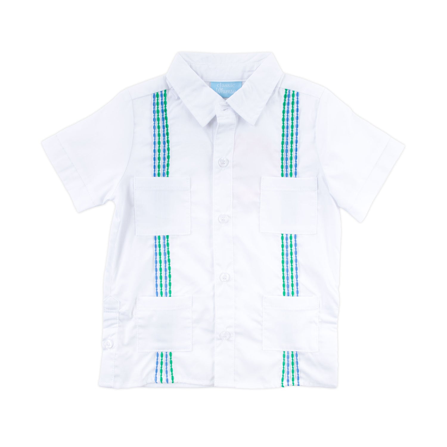 Don't forget to pack this White Guayabera Shirt with Blue & Green Embroidery for your next resort vacation or Cinco de Mayo celebration! It features four front pockets and blue and green embroidery details. Personalize this Guayabera for your toddler boy or big kid by adding a monogram.