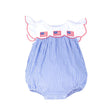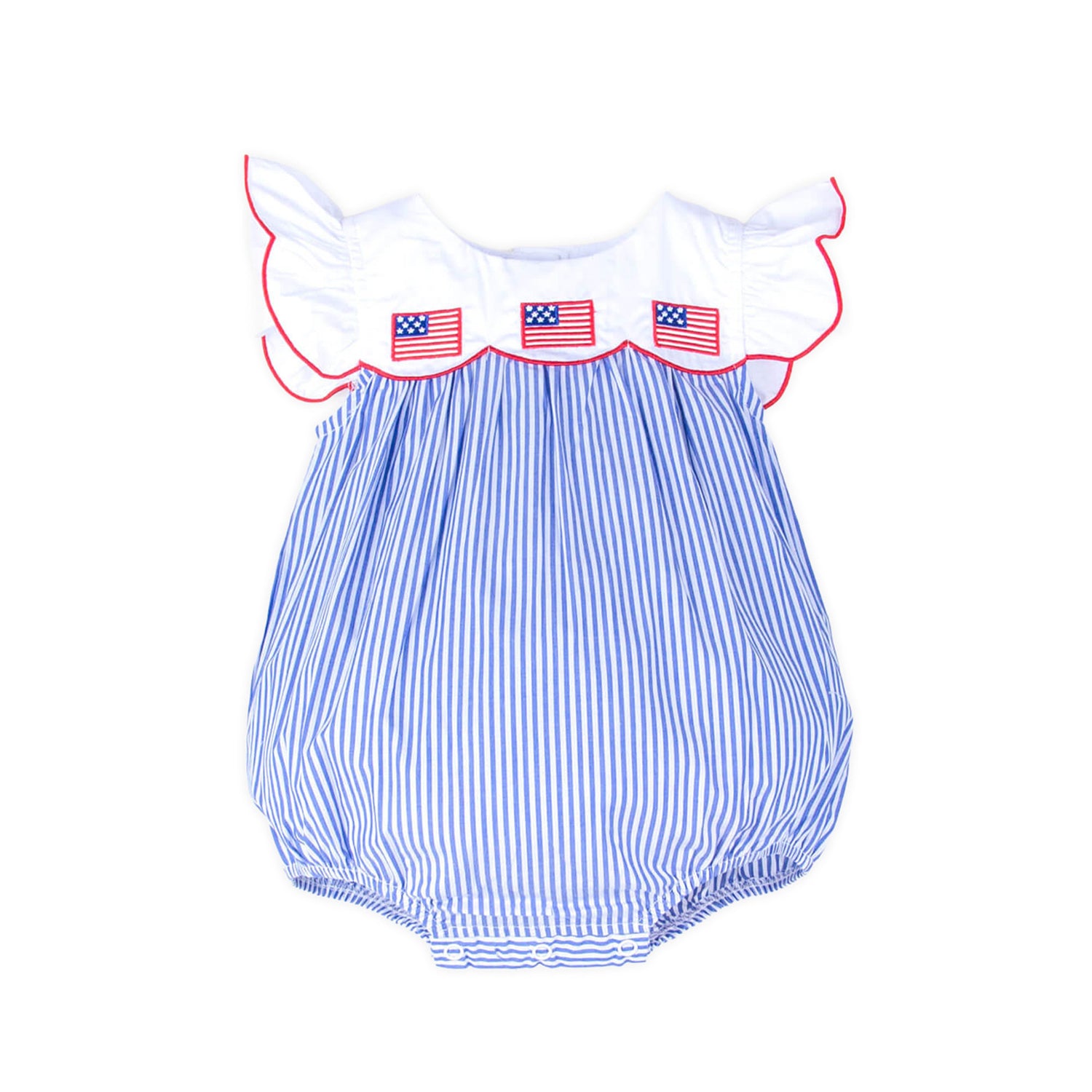 This American Flag Blue Stripe Amelia Bubble is perfect for celebrating the 4th of July and enjoying fireworks. The Amelia-style bubble, adorned with embroidered American flags, flutter sleeves, and a scalloped hem with red trim, captures the patriotic spirit. With convenient snaps, dressing is a breeze.