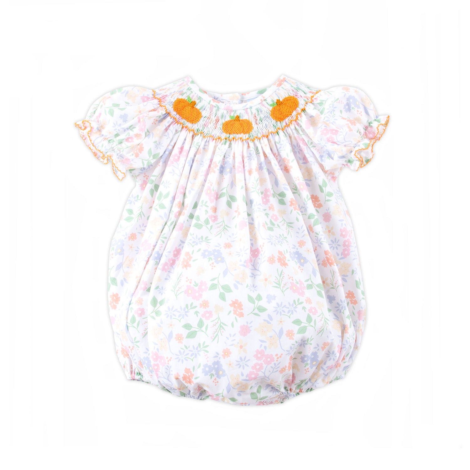 Celebrate the magic of fall in our oh-so-sweet Autumn Floral Pumpkin Smocked Bishop Bubble! This darling bubble features a delightful floral print, sweet pumpkin smocking, and the cutest bishop sleeves for an extra dash of charm. Snaps in the stride make changes quick and easy. Perfect for twirling through pumpkin patches and enjoying crisp autumn days!