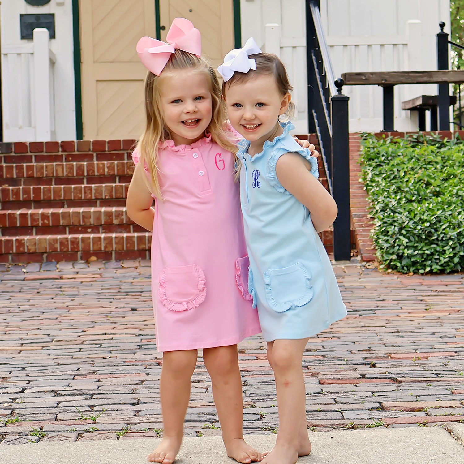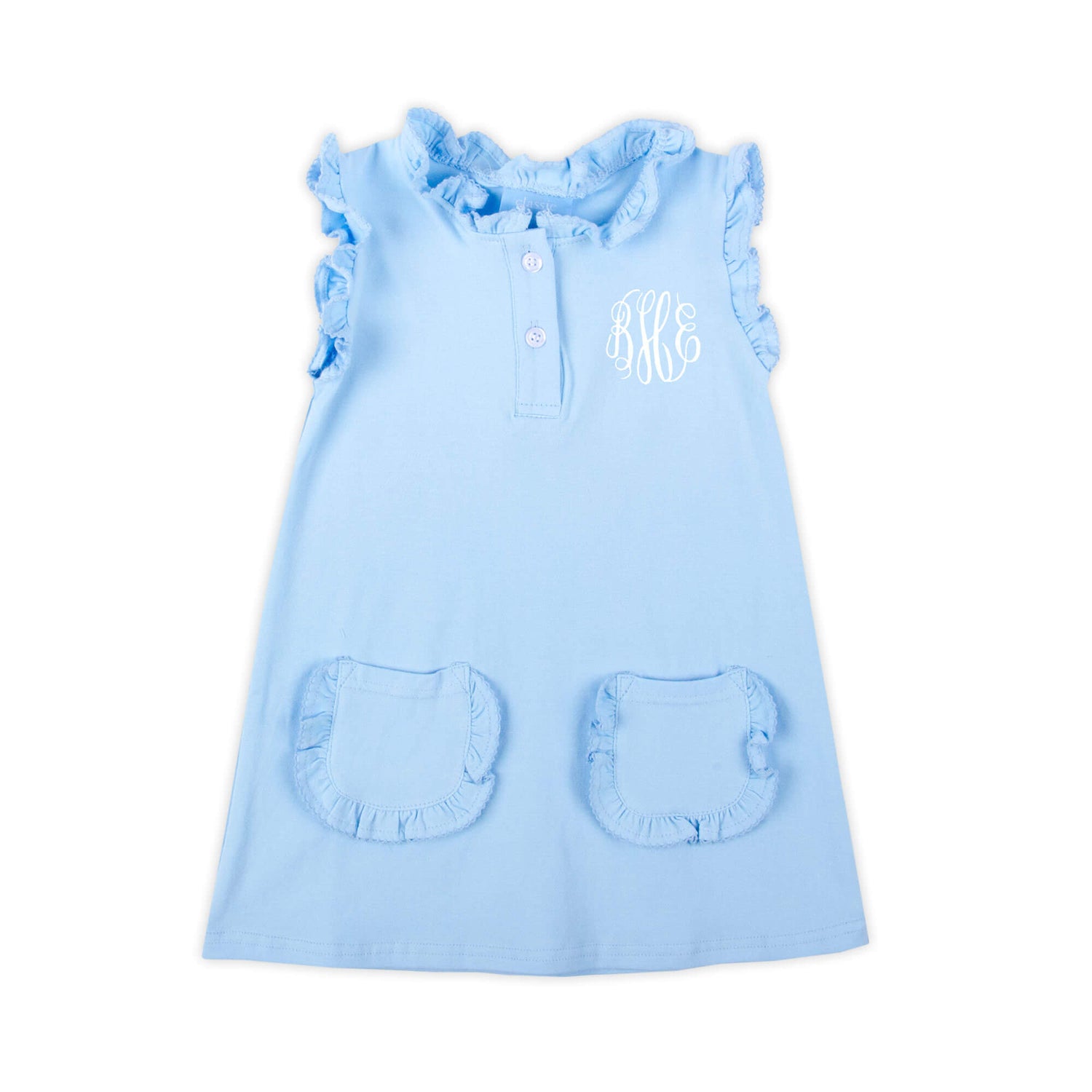 Elevate playtime with our Light Blue Nicole Dress! This Nicole-style dress features delightful ruffle trim, front buttons, and two cute ruffle pockets. Complete the look with a cute monogram for an extra touch of charm. It's the perfect outfit for playtime.