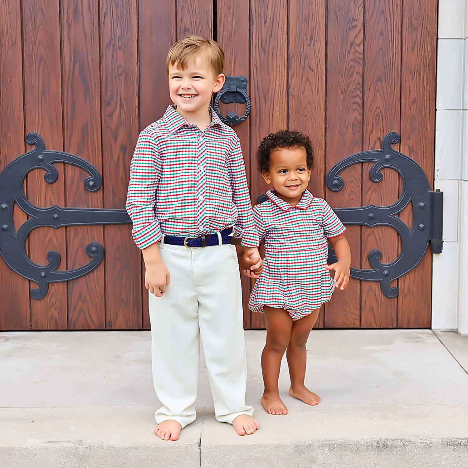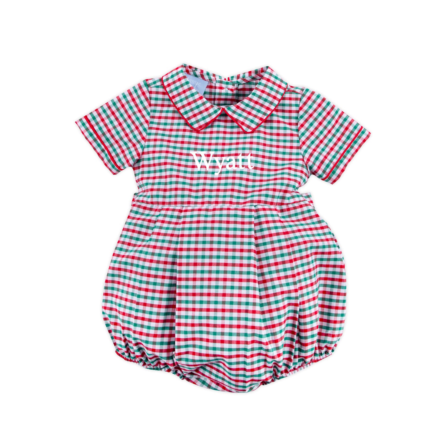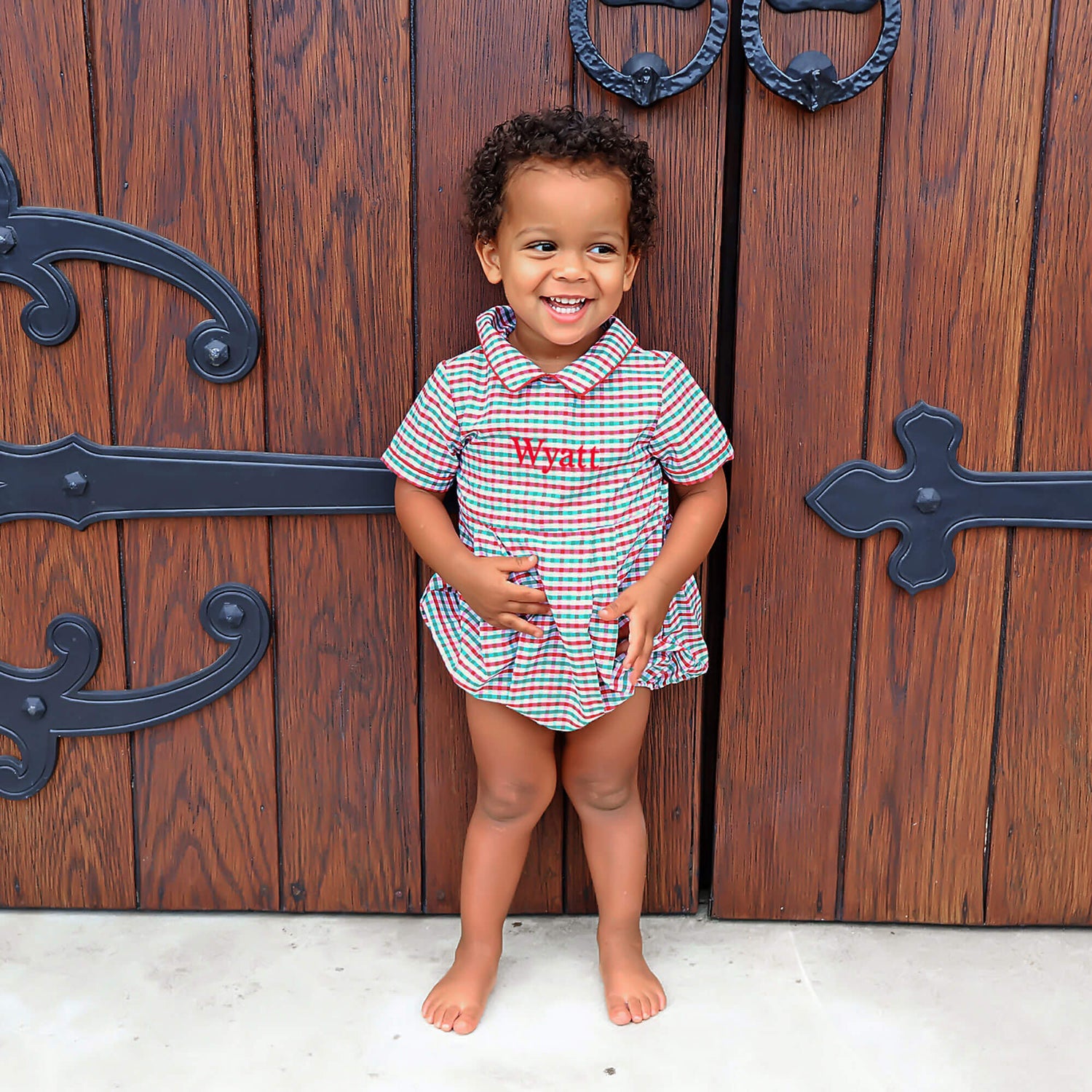 Get ready for the holidays with our Christmas Card Gingham Collared Bubble! This charming green gingham bubble features a cute collar and short sleeves, ensuring festive style. With convenient snaps in stride, it's both adorable and practical. Add a monogram for a personalized holiday touch.