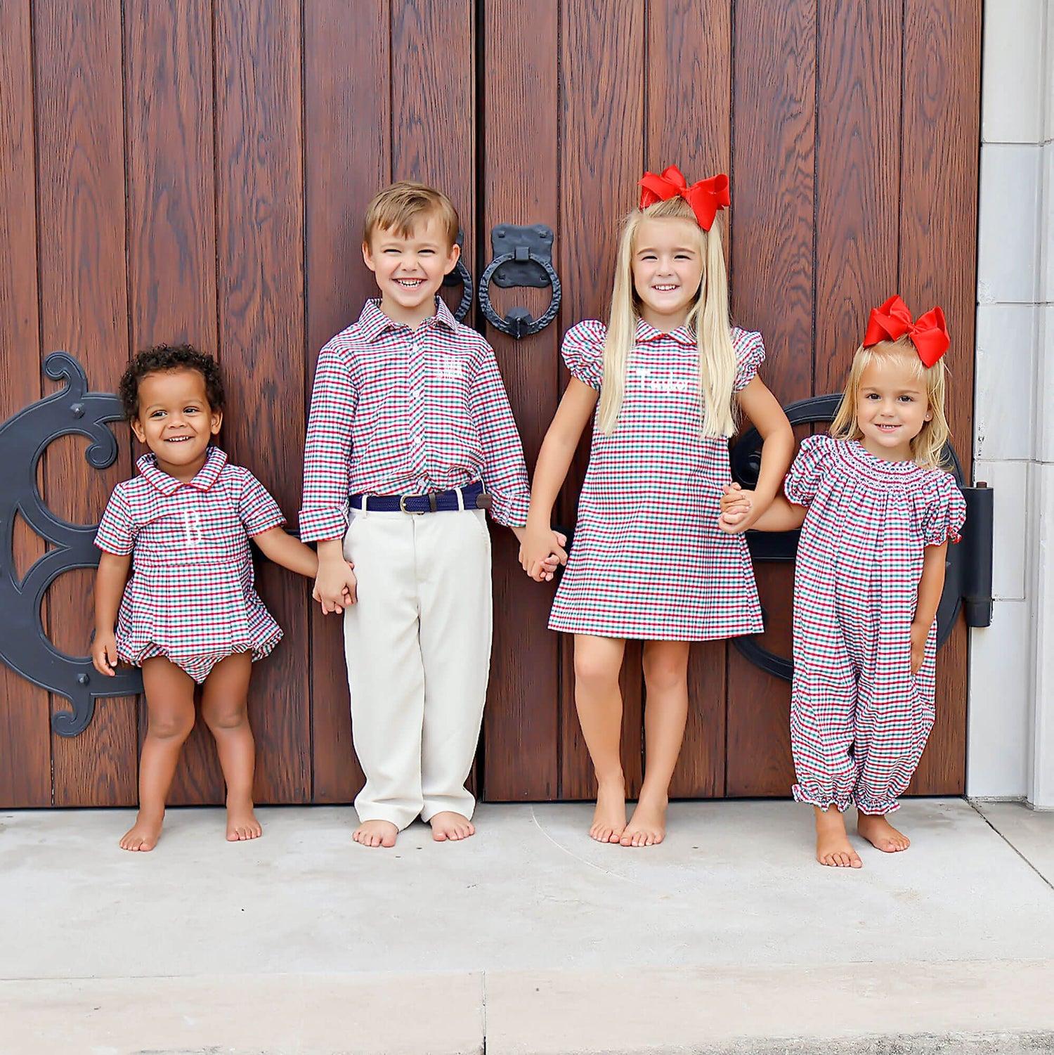 Celebrate Christmas in our Christmas Card Gingham Smocked Long Bubble. This charming green gingham bubble features elegant smocking, and bishop sleeves with red ric rac trim. With snaps in stride for easy dressing, making it perfect for the festive season. A timeless choice for your holiday celebrations!
