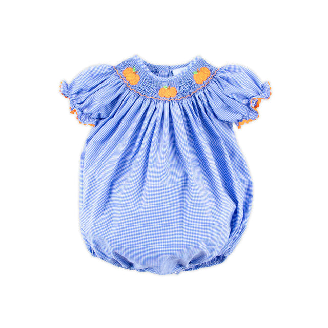 Get your little one picture ready for pumpkin patch adventures in our adorable Cluster Pumpkin Smocked Royal Windowpane Bubble! This charming bubble features hand-smocked cluster pumpkins, sweet bishop sleeves trimmed with orange ric rac, and easy snaps in the stride for quick changes. A fall favorite for all your festive outings!