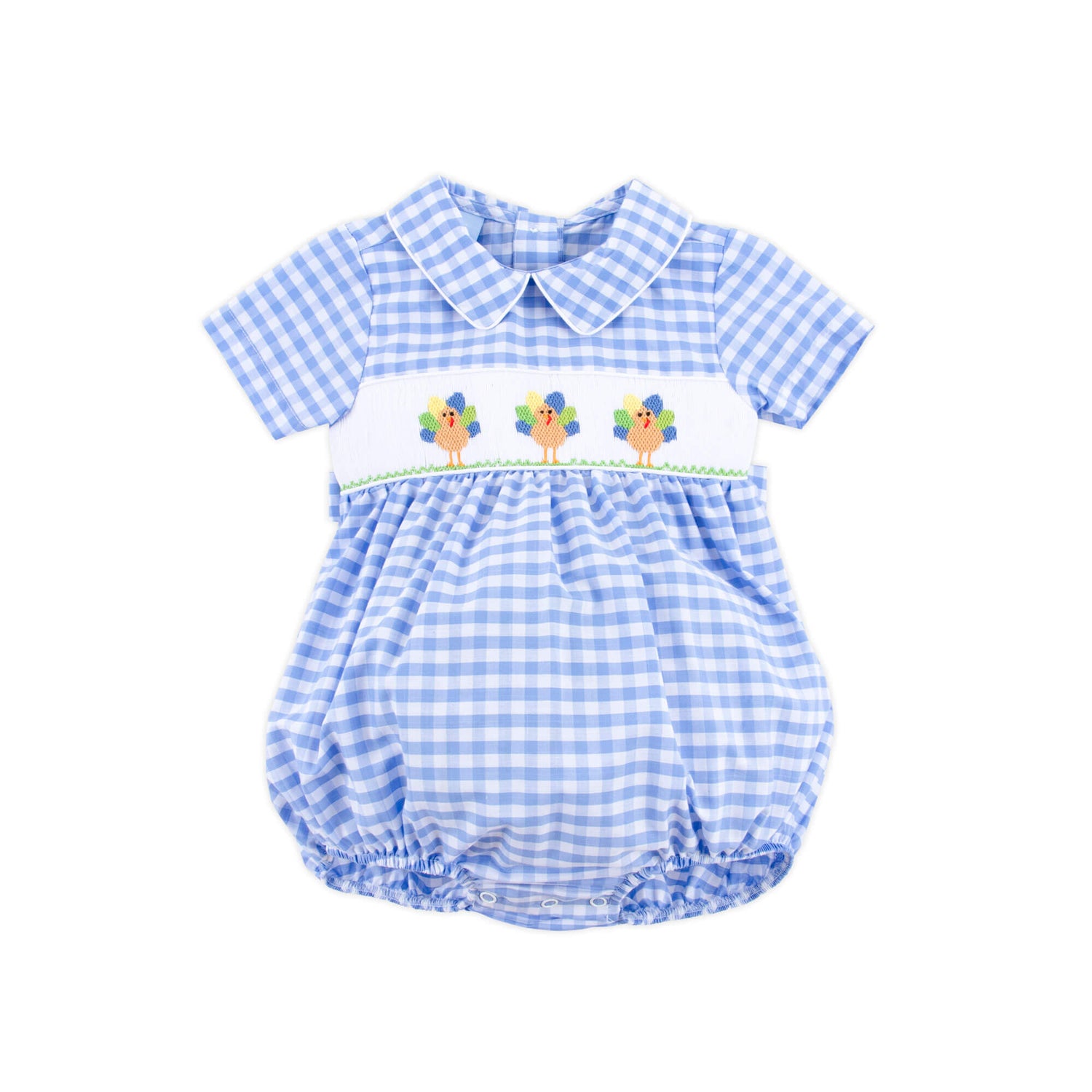 Get your little one ready for your family gathering this Thanksgiving in our Colorful Turkey Smocked Blue Gingham Collared Bubble! This festive blue gingham bubble features a collar and three adorable smocked turkeys, making it the perfect choice for holiday gatherings and family celebrations. With snaps at the stride make changes easy.