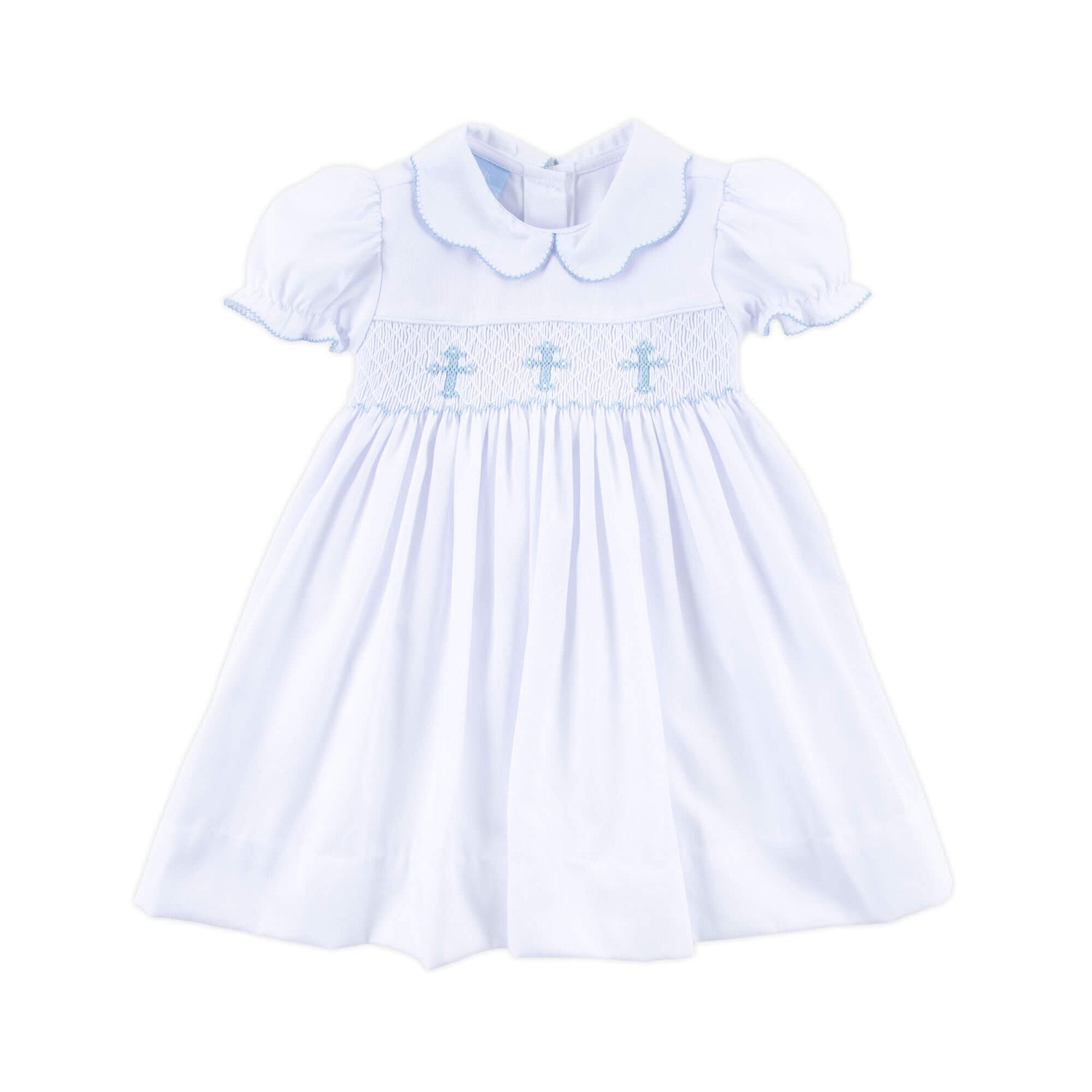 With this Cross Smocked White Piqué Collared Dress, your little angel will look absolutely stunning on her Christening Day or any special church event! This white piqué dress features hand-smocked blue crosses, a scalloped collar, bishop sleeves, and a sash tie for the sweetest finishing touch.