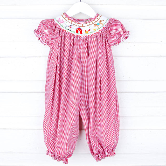 Your little one will adore this Farm Smocked Red Gingham Bloomer Set. The charming red gingham top features a smocked red barn and adorable animals like pigs, cows, horses, and roosters. Coordinated with matching red gingham bloomers, it's the perfect outfit for a farm-themed party or play date.