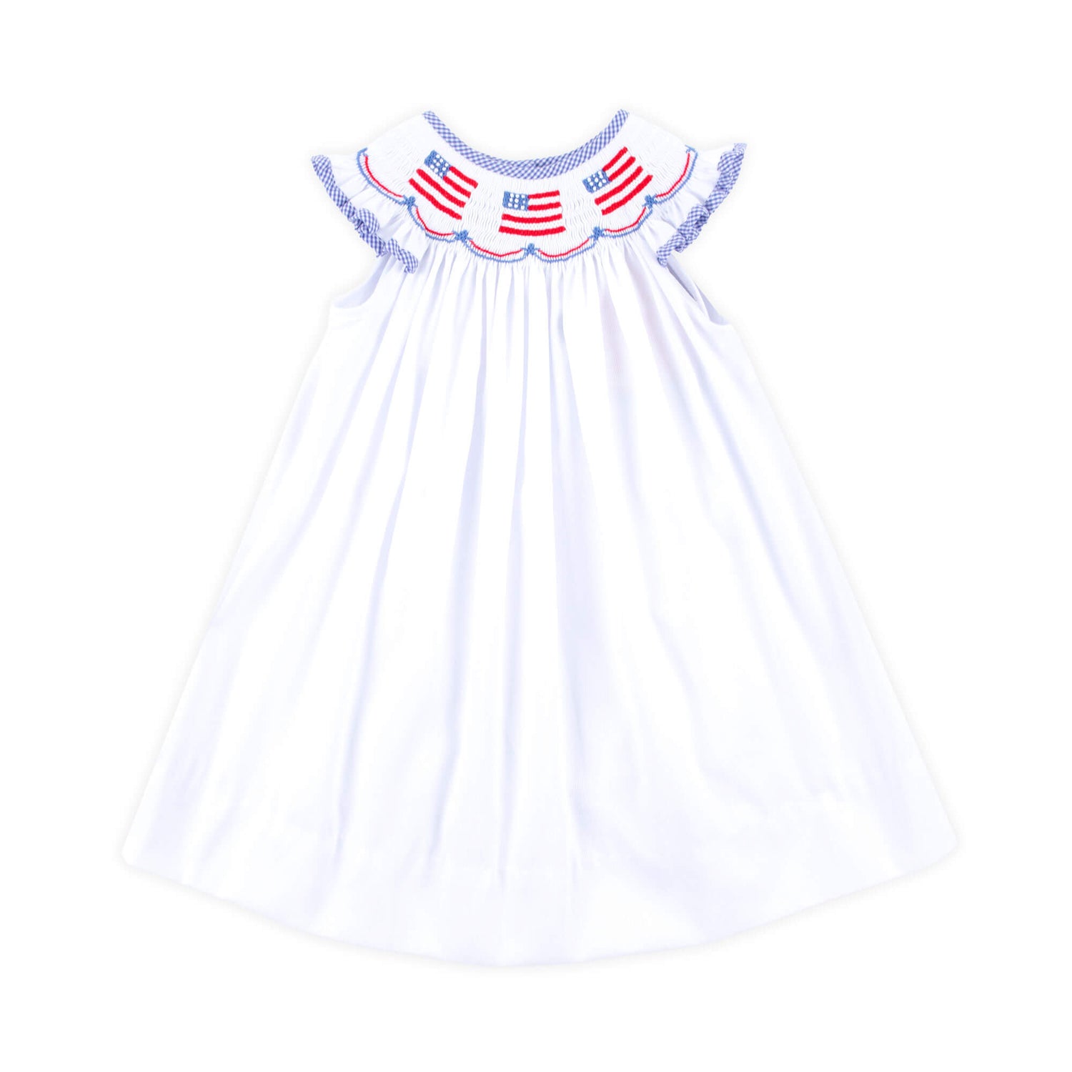 This Flag Smocked White Pique Dress is perfect for celebrating the 4th of July in classic patriotic style. Designed in white pique, it features angel flutter sleeves with blue gingham trim and hand-smocked flags for a sweet, festive look
